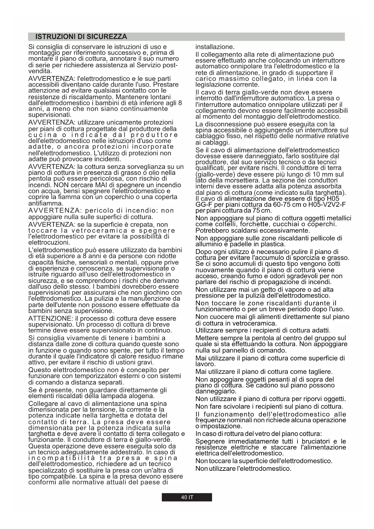 Il cavo di terra giallo-verde non deve essere interrotto dall'interruttore automatico. La presa o l'interruttore automatico onnipolare utilizzati per il collegamento devono essere facilmente accessibili al momento del montaggio dell'elettrodomestico. Se il cavo di alimentazione dell'elettrodomestico dovesse essere danneggiato, farlo sostituire dal produttore, dal suo servizio tecnico o da tecnici qualificati, per evitare rischi. Il conduttore di terra (giallo-verde) deve essere più lungo di 10 mm sul lato della morsettiera. La sezione dei conduttori interni deve essere adatta alla potenza assorbita dal piano di cottura (come indicato sulla targhetta). Il cavo di alimentazione deve essere di tipo H05 GG-F per pancottura da 60-75 cm o H05-V2V2-F per pancottura da 75 cm. Non appoggiare oggetti pesanti al di sopra del piano di cottura. Se cadono sul piano possono danneggiarlo. Non cuocere mai gli alimenti direttamente sul piano di cottura in vetroceramica. Utilizzare sempre i recipienti di cottura adatti. Non utilizzare il piano di cottura per riporvi oggetti. Non appoggiare sulle zone riscaldanti pellicole di alluminio e padelle in plastica. Non fare scivolare i recipienti sul piano di cottura. Non toccare le zone riscaldanti durante il funzionamento o per un breve periodo dopo l'uso. installazione. Non utilizzare mai un getto di vapore o ad alta pressione per la pulizia dell'elettrodomestico. Il funzonamento dell'elettrodomestco alle frequenze nomnalnon rchede alcuna operazone ompostazone. In caso drottura del vetro del pano cottura: Spegnere mmedatamente tuttbrucatore le resstenze elettrche e staccare l'almentazone elettrca dell'elettrodomestco. Non appoggiare sul piano di cottura oggetti metallici come coltelli, forchette, cucchiai o coperchi. Potrebbero scaldarsi eccessivamente. Mai utilizzare il piano di cottura come superficie di lavoro. La disconnessione può essere eseguita con la spina accessibile o aggiungendo un interruttore sul cablaggio fisso, nel rispetto delle normative relative ai cablaggi. Dopo ogni utilizzo è necessario pulire il piano di cottura per evitare l'accumulo di sporcizia e grasso. Se ci sono accumuli di questo tipo vengono cotti nuovamente quando il piano di cottura viene acceso, creando fumo e odori sgradevoli per non parlare del rischio di propagazione di incendi. Mettere sempre la pentola al centro del gruppo sul quale si sta effettuando la cottura. Non appoggiare nulla sul pannello di comando. Mai utilizzare il piano di cottura come tagliere. Non toccare la superfce dell'elettrodomestco. Non utlzzare l'elettrodomestco. Il collegamento alla rete di alimentazione può essere effettuato anche collocando un interruttore automatico onnipolare tra l'elettrodomestico e la rete di alimentazione, in grado di supportare il carico massimo collegato, in linea con la legislazione corrente.Qualora sotto II plano cottura vi sia un vano accessibile bisogna predisporre un parete di divisione In materiale Isolante (legno o slmili) (Figura )2 . Il plano cottura può essere Installato In qualsiasi top che sia resistente ad una temperatura di 100°C e abbia uno spessore di 25-45 mm. La dimensione del vano di Inserimento del plano cottura è mostrata In Figura 2. La distanza tra II plano cottura e qualsiasi altro apparecchio sopra di esso (es. una cappa) non deve essere Inferiore a 70 cm .(Figura 4) Oggetti metallici nel cassetto possono raggiungere temperature elevate a seguito del ricircolo dell'aria. Pertanto si consiglia di utilizzare una separazione intermedia in legno. Qualora II plano venga Incassato In modo che sul suo lato sinistro o destro ci sia una parete, la distanza non dev'essere Inferiore a 117 cm (60 cm) o 25 cm (75 cm) (vedere Figura )2 ; mentre la distanza tra la parete posteriore e II plano deve essere di almeno .70 mm Importante - Il diagramma In figura 1 mostra come deve essere applicato il sigillante. Il piano cottura è fissato grazie a morsetti di supporto agganciati alla base. Quando un piano cottura da 75 cm viene posizionato sopra un forno, la parte posteriore deve essere raffreddata ad aria. 60 cm o