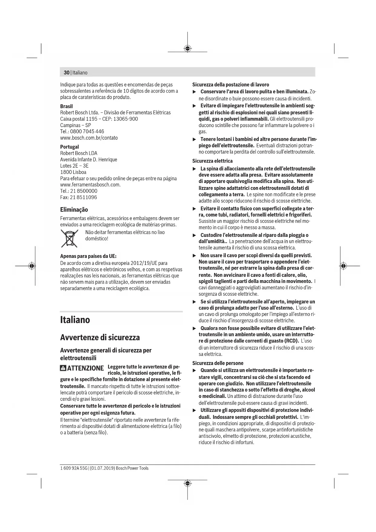 Diametro del collare alberino mm 43 Øforo max. – Muratura mm 13 – Calcestruzzo mm 13 – Acciaio mm 10 – Legno mm 25 Campo di serraggio del man- drino mm 1,5–13 Peso secondo EPTA-Procedure 01:2014 kg 1,8 Classe di protezione / II I dati sono validi per una tensione nominale [U] di 230 V. In caso di tensioni differenti e di versioni per Paesi specifici, tali dati potranno variare. Informazioni su rumorosità e vibrazioni Valori di emissione acustica rilevati conformemente a EN62841-2-1. Il livello di rumorosità ponderato A dell’elettroutensile è tipi- camente di: Livello di pressione acustica 95dB(A); Livello di potenza sonora 106dB(A). Grado d’incertezza K=5dB. Indossare protezioni acustiche. 1 609 92A 55G | (01.07.2019) Bosch Power ToolsItaliano | 33 Valori di oscillazione totali a