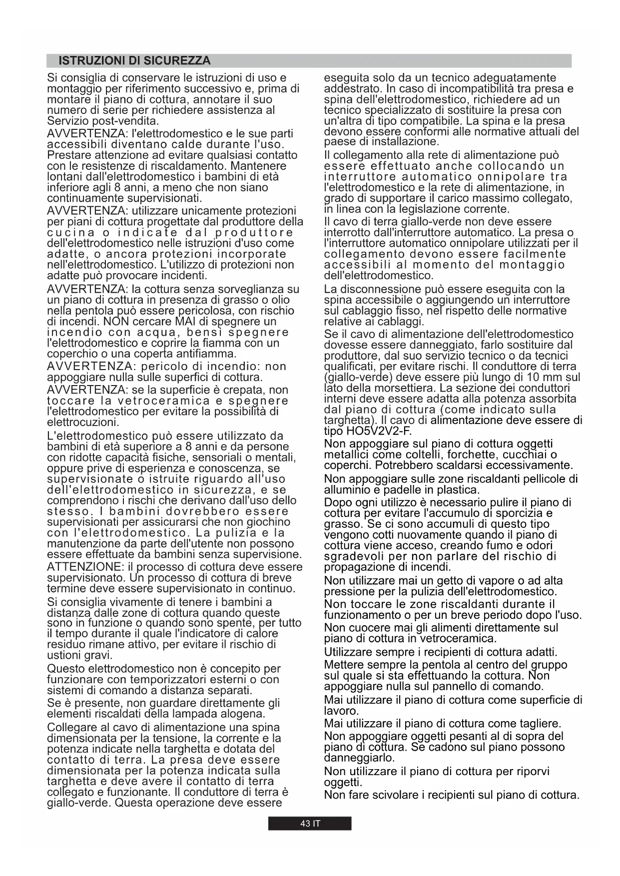 UR 3,5 kW43 IT Si consiglia di conservare le istruzioni di uso e montaggio per riferimento successivo e, prima di montare il piano di cottura, annotare il suo numero di serie per richiedere assistenza al Servizio post-vendita. AVVERTENZA: l'elettrodomestico e le sue parti accessibili diventano calde durante l'uso. Prestare attenzione ad evitare qualsiasi contatto con le resistenze di riscaldamento. Mantenere lontani dall'elettrodomestico i bambini di età inferiore agli 8 anni, a meno che non siano continuamente supervisionati. AVVERTENZA: utilizzare unicamente protezioni per piani di cottura progettate dal produttore della cucina o indicate dal produttore dell'elettrodomestico nelle istruzioni d'uso come adatte, o ancora protezioni incorporate nell'elettrodomestico. L'utilizzo di protezioni non adatte può provocare incidenti. AVVERTENZA: la cottura senza sorveglianza su un piano di cottura in presenza di grasso o olio nella pentola può essere pericolosa, con rischio di incendi. NON cercare MAI di spegnere un incendio con acqua, bensì spegnere l'elettrodomestico e coprire la fiamma con un coperchio o una coperta antifiamma. AVVERTENZA: pericolo di incendio: non appoggiare nulla sulle superfici di cottura. AVVERTENZA: se la superficie è crepata, non toccare la vetroceramica e spegnere l'elettrodomestico per evitare la possibilità di elettrocuzioni. L'elettrodomestico può essere utilizzato da bambini di età superiore a 8 anni e da persone con ridotte capacità fisiche, sensoriali o mentali, oppure prive di esperienza e conoscenza, se supervisionate o istruite riguardo all'uso dell'elettrodomestico in sicurezza, e se comprendono i rischi che derivano dall'uso dello stesso. I bambini dovrebbero essere supervisionati per assicurarsi che non giochino con l'elettrodomestico. La pulizia e la manutenzione da parte dell'utente non possono essere effettuate da bambini senza supervisione. ATTENZIONE: il processo di cottura deve essere supervisionato. Un processo di cottura di breve termine deve essere supervisionato in continuo. Si consiglia vivamente di tenere i bambini a distanza dalle zone di cottura quando queste sono in funzione o quando sono spente, per tutto il tempo durante il quale l'indicatore di calore residuo rimane attivo, per evitare il rischio di ustioni gravi. Questo elettrodomestico non è concepito per funzionare con temporizzatori esterni o con sistemi di comando a distanza separati. Se è presente, non guardare direttamente gli elementi riscaldati della lampada alogena. Collegare al cavo di alimentazione una spina dimensionata per la tensione, la corrente e la potenza indicate nella targhetta e dotata del contatto di terra. La presa deve essere dimensionata per la potenza indicata sulla targhetta e deve avere il contatto di terra collegato e funzionante. Il conduttore di terra è giallo-verde. Questa operazione deve essere