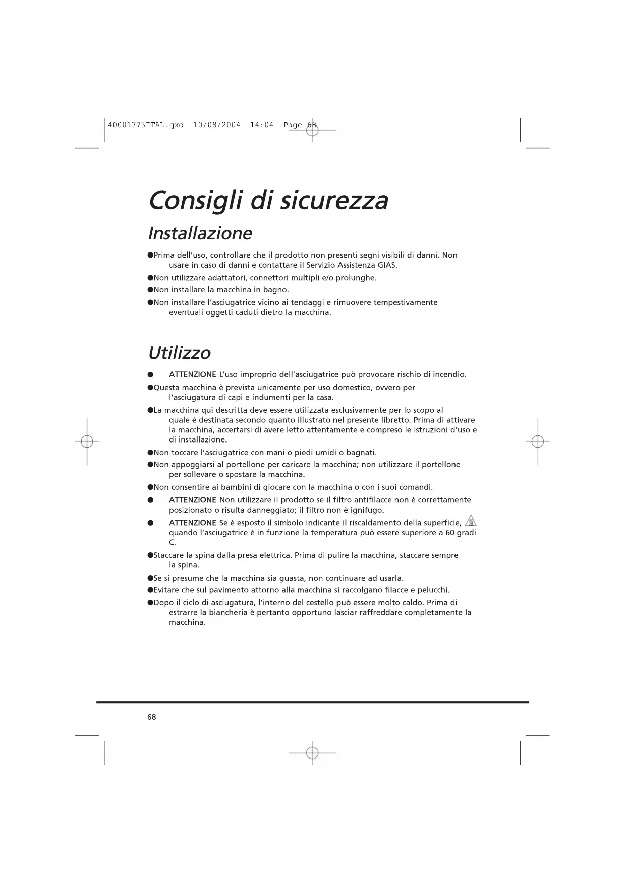 IIMMPPOORRTTAANNTTEE PPrriimmaa ddii pprroocceeddeerree aallllaa ppuulliizziiaa,, ddiissaattttiivvaarree sseemmpprree llaa mmaacccchhiinnaa ee ssttaaccccaarree llaa ssppiinnaa ddaallllaa pprreessaa aa mmuurroo.. PPeerr ii ddaattii eelleettttrriiccii vveeddeerree llaa ttaarrgghheettttaa ddeeii ddaattii ppoossttaa ssuull ddaavvaannttii ddeell mmoobbiillee ddeellllaa mmaacccchhiinnaa ((ccoonn ppoorrtteelllloonnee aappeerrttoo)).. PPuulliizziiaa ee mmaannuutteennzziioonnee oorrddiinnaarriiaa 40001773ITAL.qxd 10/08/2004 14:04 Page 7980 QQuuaallee ppuuòò eesssseerree llaa ccaauussaa...... PPrroobblleemmii cchhee ppuuòò rriissoollvveerree ll’’uutteennttee Prima di rivolgersi al Centro Assistenza GIAS, consultare la seguente checklist. La chiamata verrà addebitata all’utente nel caso in cui risulti che la macchina funziona o è stata installata o utilizzata in maniera errata. Se il problema persiste anche dopo aver eseguito i controlli consigliati, rivolgersi al servizio di assistenza GIAS che sarà a disposizione per suggerire eventuali soluzioni per telefono. TTeemmppoo ddii aasscciiuuggaattuurraa eecccceessssiivvaammeennttee lluunnggoo//ccaappii nnoonn ssuuffffiicciieenntteemmeennttee aasscciiuuttttii…… ● Il programma/tempo di asciugatura selezionato è corretto? ● I capi sono stati introdotti eccessivamente bagnati? Si è provveduto a strizzare o centrifugare adeguatamente i capi prima d’introdurli nella macchina? ● Si deve pulire il filtro? ● L’asciugatrice è stata caricata eccessivamente? ● Il tubo di sfiato è piegato o bloccato? ● Il tasto è stato selezionato da un ciclo precedente? LL’’aasscciiuuggaattrriiccee nnoonn ffuunnzziioonnaa…… ● L’alimentazione elettrica cui è collegata la macchina è attiva? Controllare provando con un altro apparecchio (ad esempio, lampada da tavolo). ● La spina di alimentazione è stata collegata correttamente all’alimentazione elettrica? ● Manca la corrente? ● Fusibile bruciato? ● Il portellone è stato chiuso perfettamente? ● La macchina è stata opportunamente attivata (sia collegata all’alimentazione sia attivata localmente)? ● È stato selezionato il tempo o il programma di asciugatura? ● La macchina è stata riattivata dopo aver aperto il portellone? LL’’aasscciiuuggaattrriiccee ffaa mmoollttoo rruummoorree…… ● Spegnere l’asciugatrice e rivolgersi al Servizio Assistenza GIAS. LLaa ssppiiaa ddii sseeggnnaallaazziioonnee PPuulliizziiaa ffiillttrroo èè aacccceessaa…… ● Si deve pulire il filtro? ● Il tubo di sfiato è piegato o bloccato? RRiicceerrccaa gguuaassttii 40001773ITAL.qxd 10/08/2004 14:04 Page 80Se il problema persiste anche dopo aver effettuato tutti i controlli consigliati, rivolgersi al Servizio Assistenza GIAS. Sarà a disposizione per suggerire eventuali soluzioni per telefono o per fissare la visita del tecnico in base alle condizioni di garanzia. Si ricorda che l’intervento del tecnico può essere soggetto a pagamento nel caso la macchina: ● risulti perfettamente funzionante. ● non sia stata installata secondo quanto indicato nelle istruzioni d’installazione. ● sia stata utilizzata in modo improprio. RRiiccaammbbii UUttiilliizzzzaarree sseemmpprree rriiccaammbbii oorriiggiinnaallii,, ddiissppoonniibbiillii ddiirreettttaammeennttee pprreessssoo iill SSeerrvviizziioo AAssssiisstteennzzaa GGIIAASS.. SSeerrvviizziioo GGIIAASS PPeerr aassssiisstteennzzaa ee rriippaarraazziioonnii,, rriivvoollggeerrssii aall tteeccnniiccoo ddeell SSeerrvviizziioo AAssssiisstteennzzaa GGIIAASS ppiiùù vviicciinnoo.. Il produttore declina ogni responsabilità in caso di eventuali errori di stampa nel presente opuscolo. Il produttore si riserva il diritto di apportare le necessarie modifiche ai propri prodotti senza modificarne le caratteristiche essenziali.