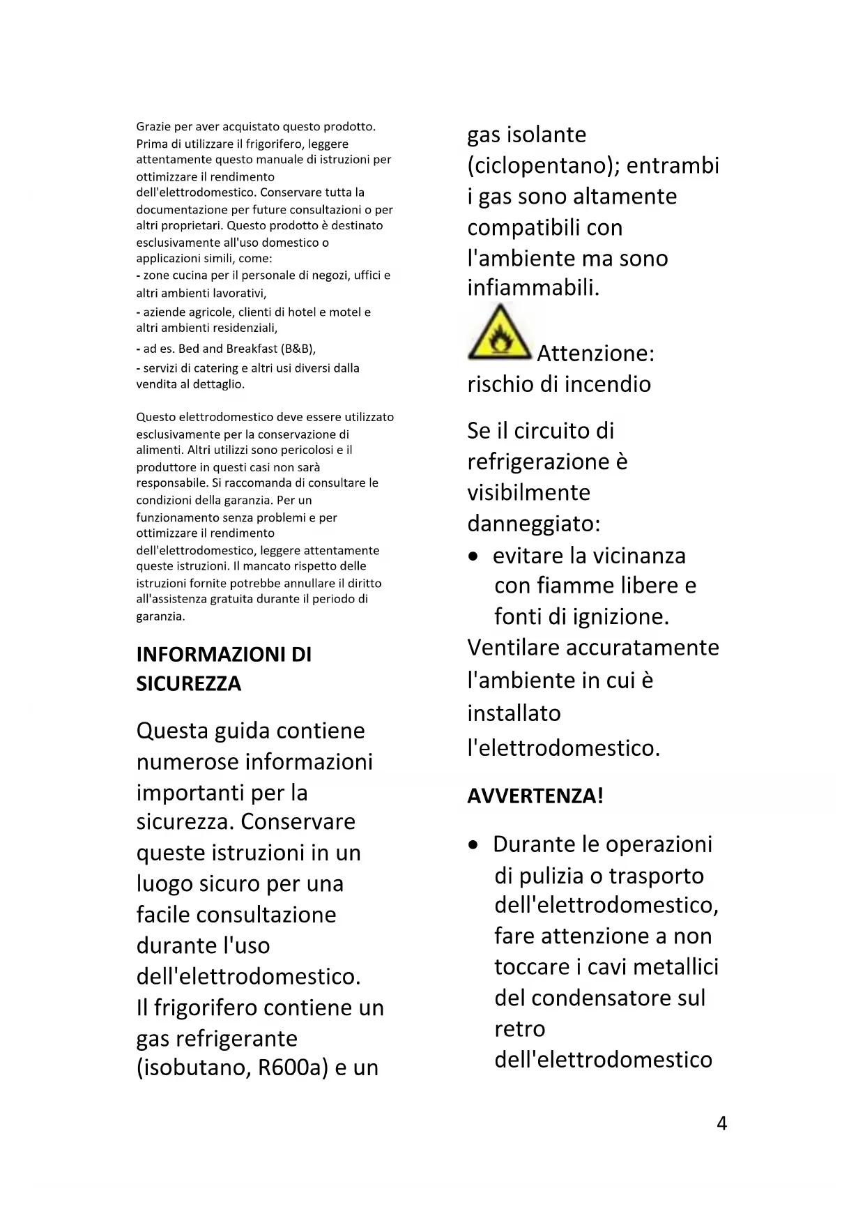 - evitare la vicinanza con fiamme libere e fonti di ignizione. Ventilare accuratamente l'ambiente in cui è installato l'elettrodomestico. AVVERTENZA!