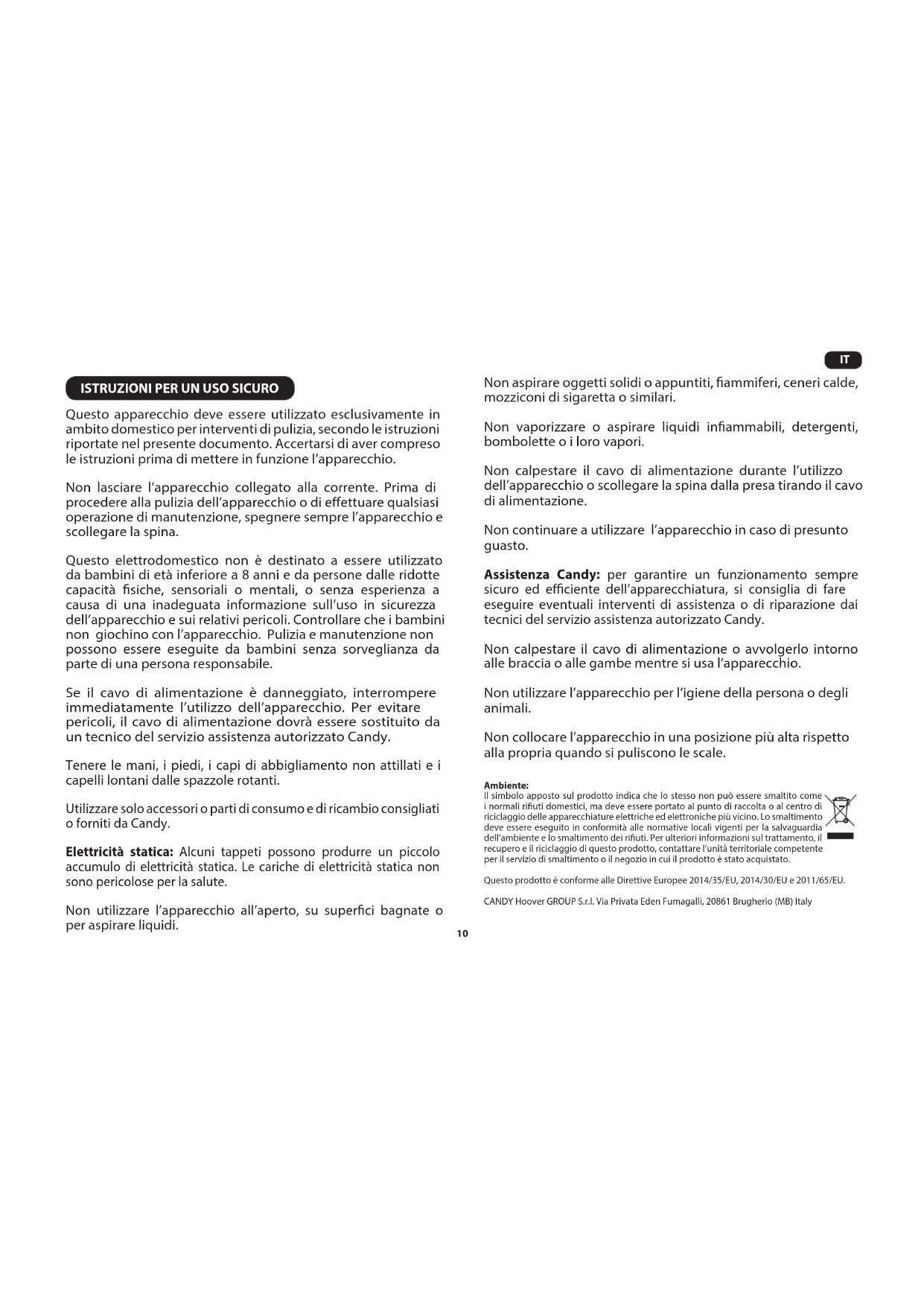 Questo apparecchio deve essere utilizzato esclusivamente in ambito domestico per interventi di pulizia, secondo le istruzioni riportate nel presente documento. Accertarsi di aver compreso le istruzioni prima di mettere in funzione l’apparecchio. Non lasciare l’apparecchio collegato alla corrente. Prima di procedere alla pulizia dell’apparecchio o di eettuare qualsiasi operazione di manutenzione, spegnere sempre l’apparecchio e scollegare la spina. Questo elettrodomestico non è destinato a essere utilizzato da bambini di età inferiore a 8 anni e da persone dalle ridotte capacità siche, sensoriali o mentali, o senza esperienza a causa di una inadeguata informazione sull’uso in sicurezza dell’apparecchio e sui relativi pericoli. Controllare che i bambini non giochino con l’apparecchio. Pulizia e manutenzione non possono essere eseguite da bambini senza sorveglianza da parte di una persona responsabile. Se il cavo di alimentazione è danneggiato, interrompere immediatamente l’utilizzo dell’apparecchio. Per evitare pericoli, il cavo di alimentazione dovrà essere sostituito da un tecnico del servizio assistenza autorizzato Candy. Tenere le mani, i piedi, i capi di abbigliamento non attillati e i capelli lontani dalle spazzole rotanti. Utilizzare solo accessori o parti di consumo e di ricambio consigliati o forniti da Candy. Elettricità statica: Alcuni tappeti possono produrre un piccolo accumulo di elettricità statica. Le cariche di elettricità statica non sono pericolose per la salute. Non utilizzare l’apparecchio all’aperto, su superci bagnate o per aspirare liquidi. Non aspirare oggetti solidi o appuntiti, ammiferi, ceneri calde, mozziconi di sigaretta o similari. Non vaporizzare o aspirare liquidi inammabili, detergenti, bombolette o i loro vapori. Non calpestare il cavo di alimentazione durante l’utilizzo dell’apparecchio o scollegare la spina dalla presa tirando il cavo di alimentazione. Non continuare a utilizzare l’apparecchio in caso di presunto guasto. Assistenza Candy: per garantire un funzionamento sempre sicuro ed eciente dell’apparecchiatura, si consiglia di fare eseguire eventuali interventi di assistenza o di riparazione dai tecnici del servizio assistenza autorizzato Candy. Non calpestare il cavo di alimentazione o avvolgerlo intorno alle braccia o alle gambe mentre si usa l’apparecchio. Non utilizzare l’apparecchio per l’igiene della persona o degli animali. Non collocare l’apparecchio in una posizione più alta rispetto alla propria quando si puliscono le scale. Ambiente: Il simbolo apposto sul prodotto indica che lo stesso non può essere smaltito come i normali riuti domestici, ma deve essere portato al punto di raccolta o al centro di riciclaggio delle apparecchiature elettriche ed elettroniche più vicino. Lo smaltimento deve essere eseguito in conformità alle normative locali vigenti per la salvaguardia dell’ambiente e lo smaltimento dei riuti. Per ulteriori informazioni sul trattamento, il recupero e il riciclaggio di questo prodotto, contattare l’unità territoriale competente per il servizio di smaltimento o il negozio in cui il prodotto è stato acquistato. Questo prodotto è conforme alle Direttive Europee 2014/35/EU, 2014/30/EU e 2011/65/EU. CANDY Hoover GROUP S.r.l. Via Privata Eden Fumagalli, 20861 Brugherio (MB) Italy11