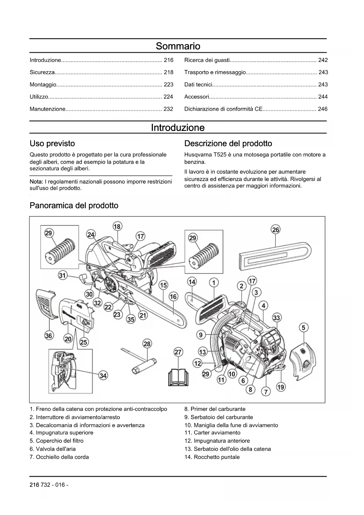 - Dichiarazione di conformità CE Introduzione Uso previsto Questo prodotto è progettato per la cura professionale degli alberi, come ad esempio la potatura e la sezionatura degli alberi. Nota: I regolamenti nazionali possono imporre restrizioni sull'uso del prodotto. Descrizione del prodotto Husqvarna T525 è una motosega portatile con motore a benzina. Il lavoro è in costante evoluzione per aumentare sicurezza ed efficienza durante le attività. Rivolgersi al centro di assistenza per maggiori informazioni. Panoramica del prodotto p. 246