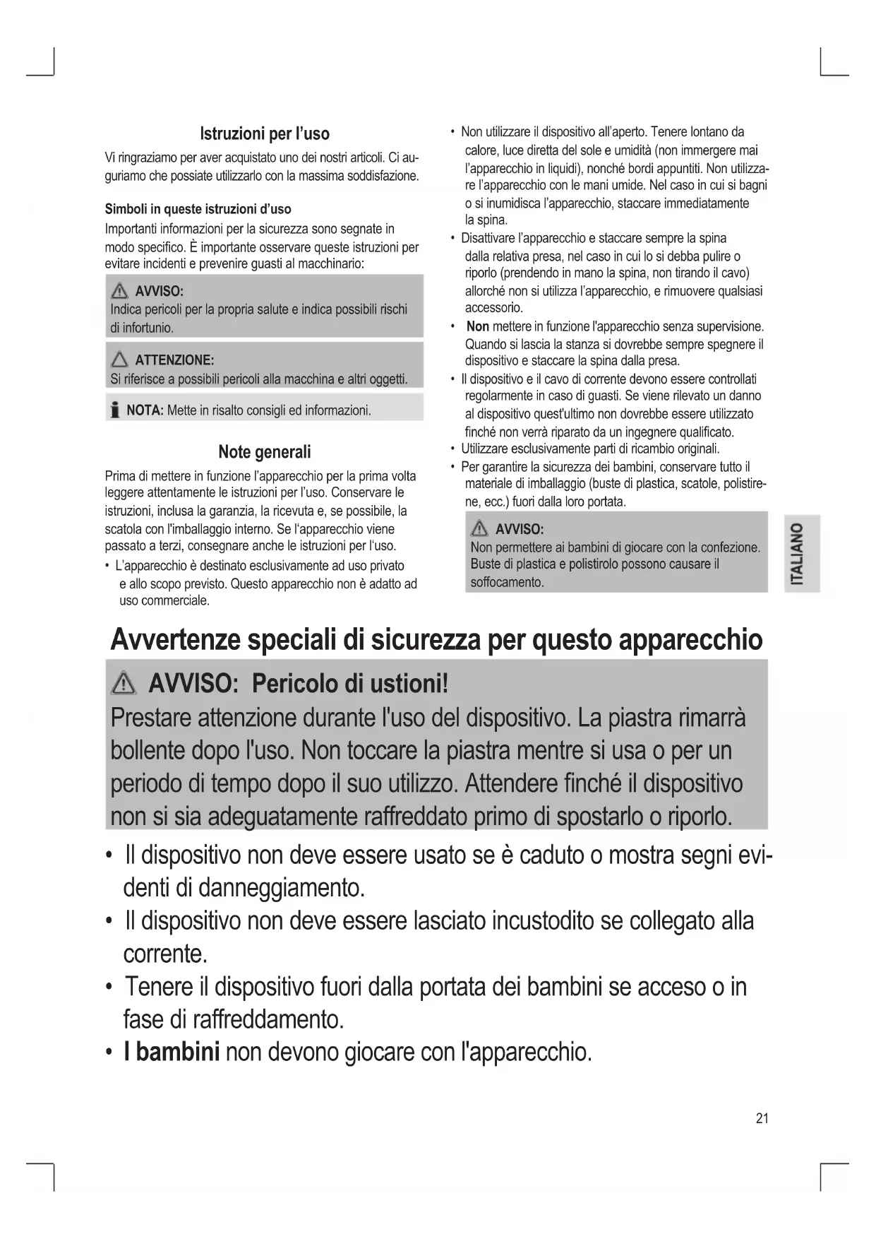 - Per garantire la sicurezza dei bambini, conservare tutto il materiale di imballaggio (buste di plastica, scatole, polistire- ne, ecc.) fuori dalla loro portata. AVVISO: Non permettere ai bambini di giocare con la confezione. Buste di plastica e polistirolo possono causare il soffocamento. Avvertenze speciali di sicurezza per questo apparecchio AVVISO: Pericolo di ustioni! Prestare attenzione durante l'uso del dispositivo. La piastra rimarrà bollente dopo l'uso. Non toccare la piastra mentre si usa o per un periodo di tempo dopo il suo utilizzo. Attendere nché il dispositivo non si sia adeguatamente raffreddato primo di spostarlo o riporlo.