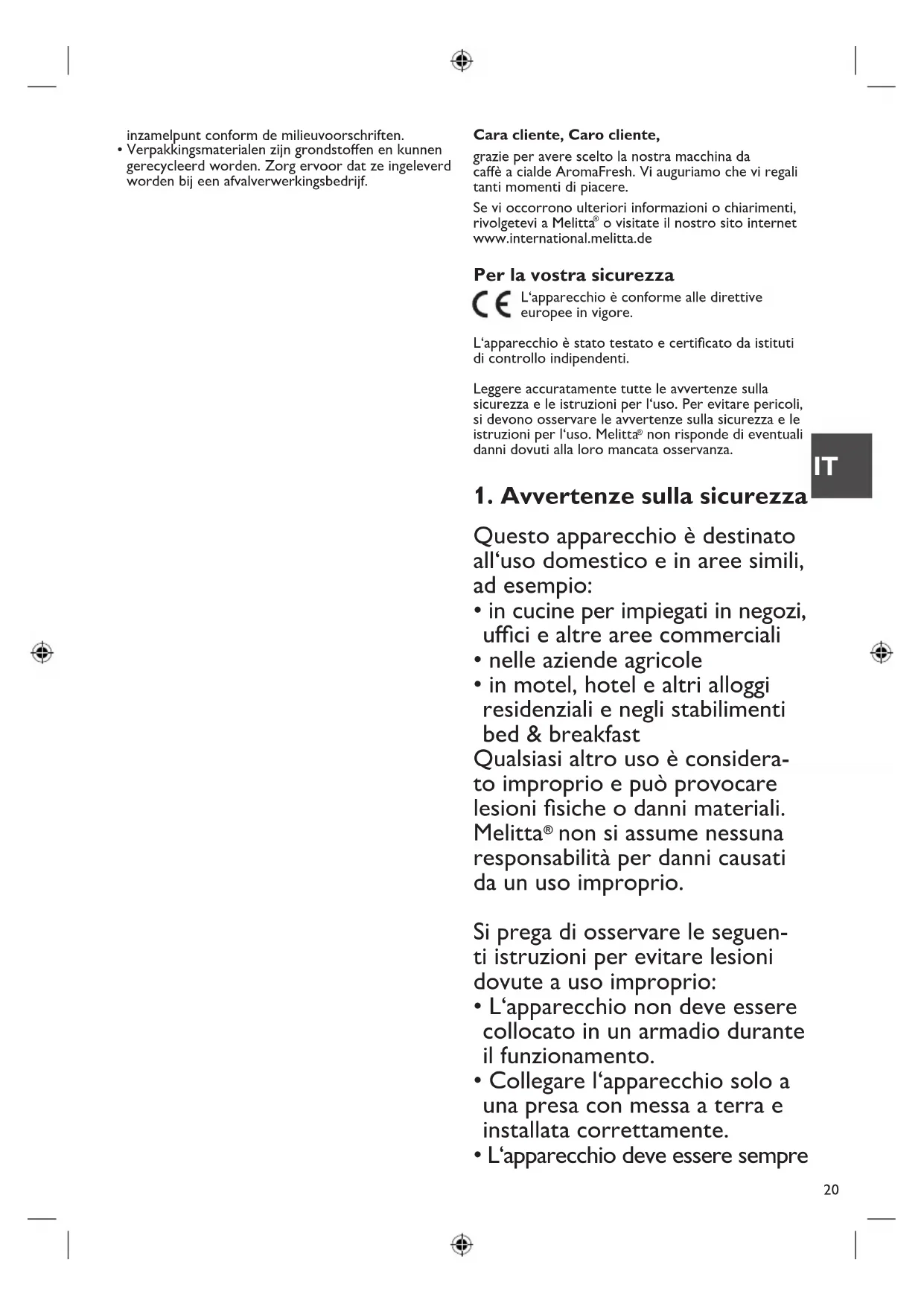 - inmotel,hotelealtrialloggi residenziali e negli stabilimenti bed&breakfast Qualsiasi altro uso è considera- to improprio e può provocare lesioni fisiche o danni materiali. Melitta