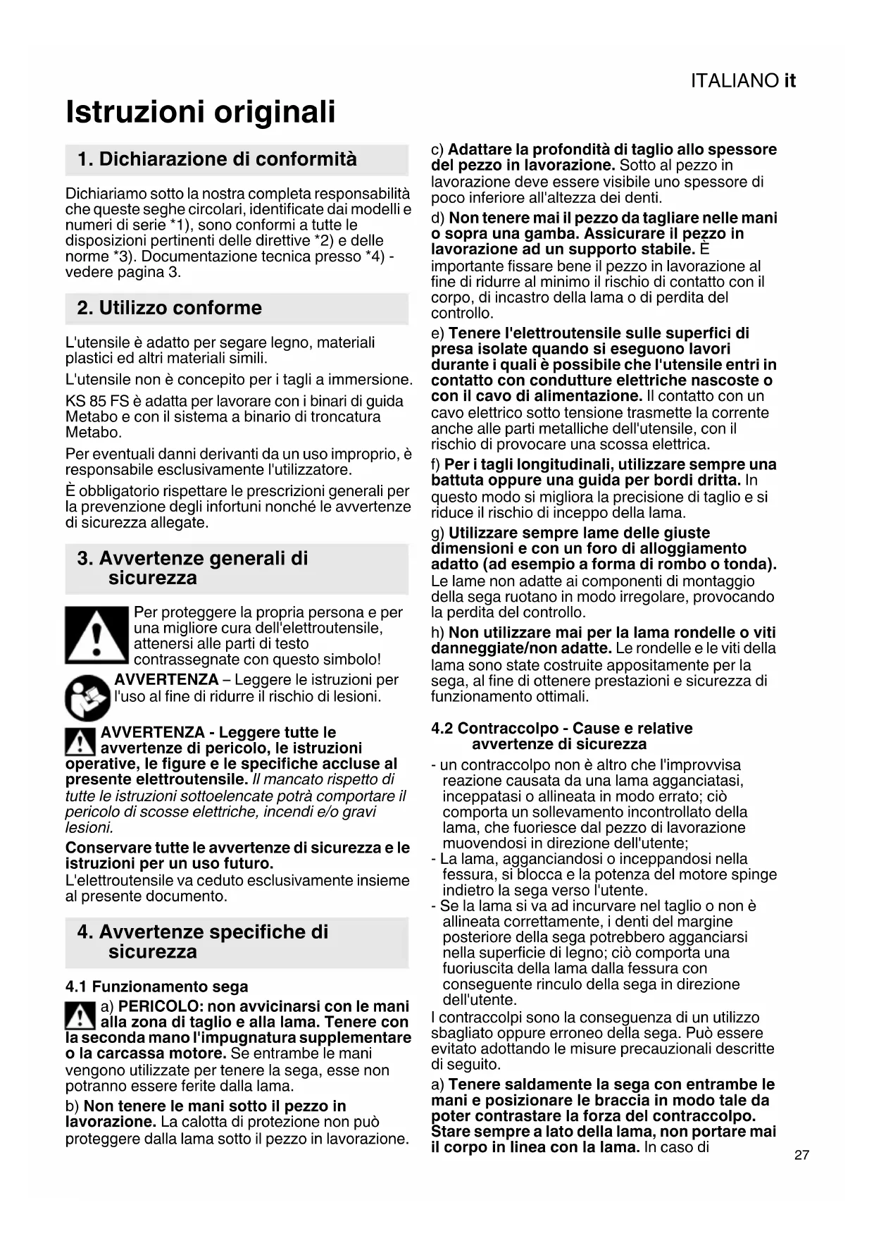 Istruzioni originali Dichiariamo sotto la nostra completa responsabilità che queste seghe circolari, identificate dai modelli e numeri di serie *1), sono conformi a tutte le disposizioni pertinenti delle direttive *2) e delle norme *3). Documentazione tecnica presso *4) - vedere pagina 3. L'utensile è adatto per segare legno, materiali plastici ed altri materiali simili. L'utensile non è concepito per i tagli a immersione. KS 85 FS è adatta per lavorare con i binari di guida Metabo e con il sistema a binario di troncatura Metabo. Per eventuali danni derivanti da un uso improprio, è responsabile esclusivamente l'utilizzatore. È obbligatorio rispettare le prescrizioni generali per la prevenzione degli infortuni nonché le avvertenze di sicurezza allegate. Per proteggere la propria persona e per una migliore cura dell'elettroutensile, attenersi alle parti di testo contrassegnate con questo simbolo! AVVERTENZA – Leggere le istruzioni per l'uso al fine di ridurre il rischio di lesioni. AVVERTENZA - Leggere tutte le avvertenze di pericolo, le istruzioni operative, le figure e le specifiche accluse al presente elettroutensile. Il mancato rispetto di tutte le istruzioni sottoelencate potrà comportare il pericolo di scosse elettriche, incendi e/o gravi lesioni. Conservare tutte le avvertenze di sicurezza e le istruzioni per un uso futuro. L'elettroutensile va ceduto esclusivamente insieme al presente documento.