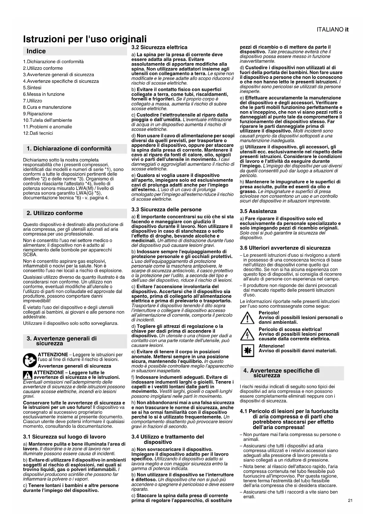 Istruzioni per l'uso originali 1.Dichiarazione di conformità 2.Utilizzo conforme 3.Avvertenze generali di sicurezza 4.Avvertenze specifiche di sicurezza 5.Sintesi 6.Messa in funzione 7.Utilizzo 8.Cura e manutenzione 9.Riparazione 10.Tutela dell'ambiente 11.Problemi e anomalie 12.Dati tecnici Dichiariamo sotto la nostra completa responsabilità che i presenti compressori, identificati dai modelli e numeri di serie *1), sono conformi a tutte le disposizioni pertinenti delle direttive *2) e delle norme *3). Organismo di controllo rilasciante l'attestato *4), livello di potenza sonora misurato LWA(M) / livello di potenza sonora garantito LWA(G) *5), documentazione tecnica *6) - v. pagina 4. Questo dispositivo è destinato alla produzione di aria compressa, per gli utensili azionati ad aria compressa per uso professionale. Non è consentito l'uso nel settore medico o alimentare; il dispositivo non è adatto al riempimento delle bombole per apparecchi SCBA. Non è consentito aspirare gas esplosivi, infiammabili o nocivi per la salute. Non è consentito l'uso nei locali a rischio di esplosione. Qualsiasi utilizzo diverso da quanto illustrato è da considerarsi non conforme. Un utilizzo non conforme, eventuali modifiche all’utensile o l’utilizzo di parti non collaudate ed approvate dal produttore, possono comportare danni imprevedibili! È vietato l'uso del dispositivo e degli utensili collegati ai bambini, ai giovani e alle persone non addestrate. Utilizzare il dispositivo solo sotto sorveglianza. ATTENZIONE – Leggere le istruzioni per l'uso al fine di ridurre il rischio di lesioni. Avvertenze generali di sicurezza ATTENZIONE – Leggere tutte le avvertenze di sicurezza e le istruzioni. Eventuali omissioni nell’adempimento delle avvertenze di sicurezza e delle istruzioni possono causare scosse elettriche, incendi e/o lesioni gravi. Conservare tutte le avvertenze di sicurezza e le istruzioni per un uso futuro! Il dispositivo va consegnato al successivo proprietario esclusivamente insieme al presente documento. Ciascun utente deve potersi informare il qualsiasi momento, consultando la documentazione.