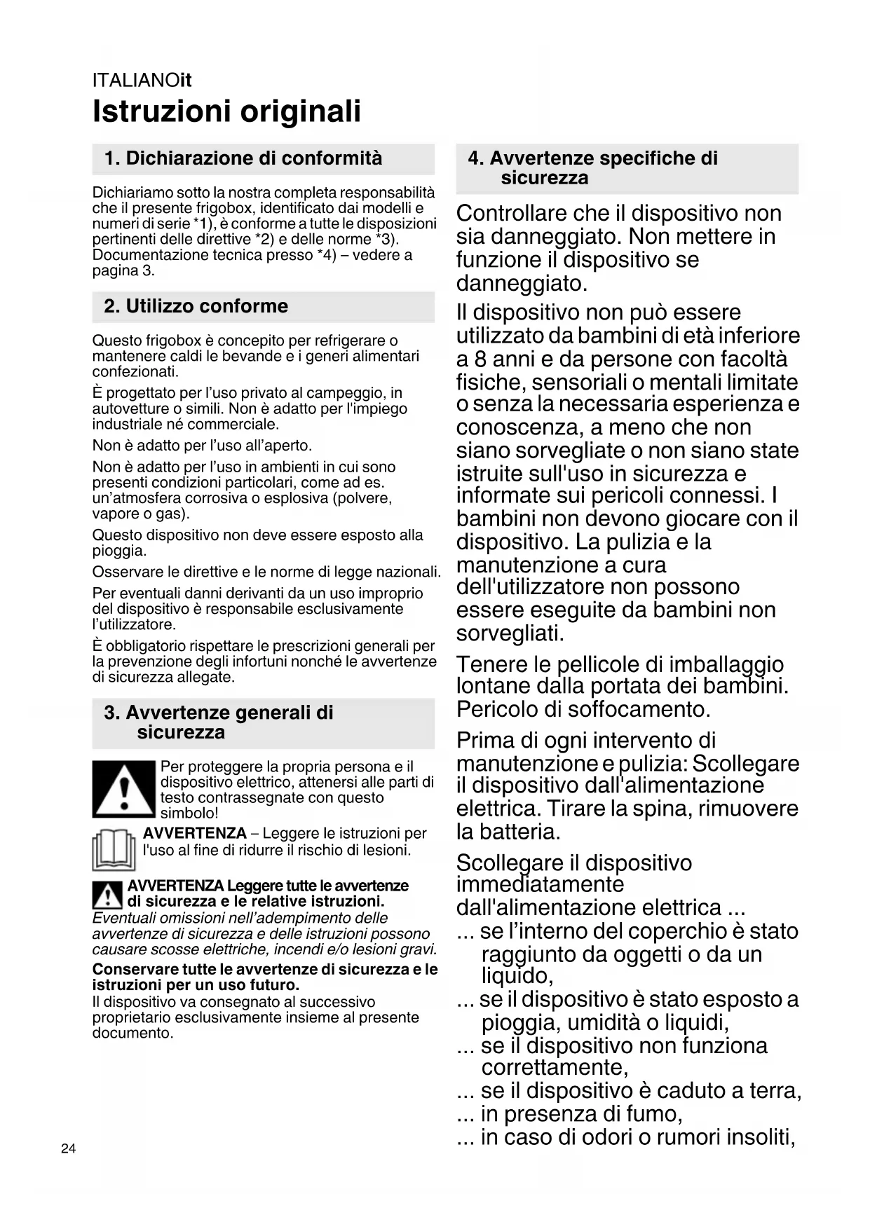 Istruzioni originali Dichiariamo sotto la nostra completa responsabilità che il presente frigobox, identificato dai modelli e numeri di serie *1), è conforme a tutte le disposizioni pertinenti delle direttive *2) e delle norme *3). Documentazione tecnica presso *4) – vedere a pagina 3. Questo frigobox è concepito per refrigerare o mantenere caldi le bevande e i generi alimentari confezionati. È progettato per l’uso privato al campeggio, in autovetture o simili. Non è adatto per l'impiego industriale né commerciale. Non è adatto per l’uso all’aperto. Non è adatto per l’uso in ambienti in cui sono presenti condizioni particolari, come ad es. un’atmosfera corrosiva o esplosiva (polvere, vapore o gas). Questo dispositivo non deve essere esposto alla pioggia. Osservare le direttive e le norme di legge nazionali. Per eventuali danni derivanti da un uso improprio del dispositivo è responsabile esclusivamente l’utilizzatore. È obbligatorio rispettare le prescrizioni generali per la prevenzione degli infortuni nonché le avvertenze di sicurezza allegate. Per proteggere la propria persona e il dispositivo elettrico, attenersi alle parti di testo contrassegnate con questo simbolo! AVVERTENZA – Leggere le istruzioni per l'uso al fine di ridurre il rischio di lesioni. AVVERTENZA Leggere tutte le avvertenze di sicurezza e le relative istruzioni. Eventuali omissioni nell’adempimento delle avvertenze di sicurezza e delle istruzioni possono causare scosse elettriche, incendi e/o lesioni gravi. Conservare tutte le avvertenze di sicurezza e le istruzioni per un uso futuro. Il dispositivo va consegnato al successivo proprietario esclusivamente insieme al presente documento. Controllare che il dispositivo non sia danneggiato. Non mettere in funzione il dispositivo se danneggiato. Il dispositivo non può essere utilizzato da bambini di età inferiore a 8 anni e da persone con facoltà fisiche, sensoriali o mentali limitate o senza la necessaria esperienza e conoscenza, a meno che non siano sorvegliate o non siano state istruite sull'uso in sicurezza e informate sui pericoli connessi. I bambini non devono giocare con il dispositivo. La pulizia e la manutenzione a cura dell'utilizzatore non possono essere eseguite da bambini non sorvegliati. Tenere le pellicole di imballaggio lontane dalla portata dei bambini. Pericolo di soffocamento. Prima di ogni intervento di manutenzione e pulizia: Scollegare il dispositivo dall'alimentazione elettrica. Tirare la spina, rimuovere la batteria. Scollegare il dispositivo immediatamente dall'alimentazione elettrica ... ... se l’interno del coperchio è stato raggiunto da oggetti o da un liquido, ... se il dispositivo è stato esposto a pioggia, umidità o liquidi, ... se il dispositivo non funziona correttamente, ... se il dispositivo è caduto a terra, ... in presenza di fumo, ... in caso di odori o rumori insoliti,