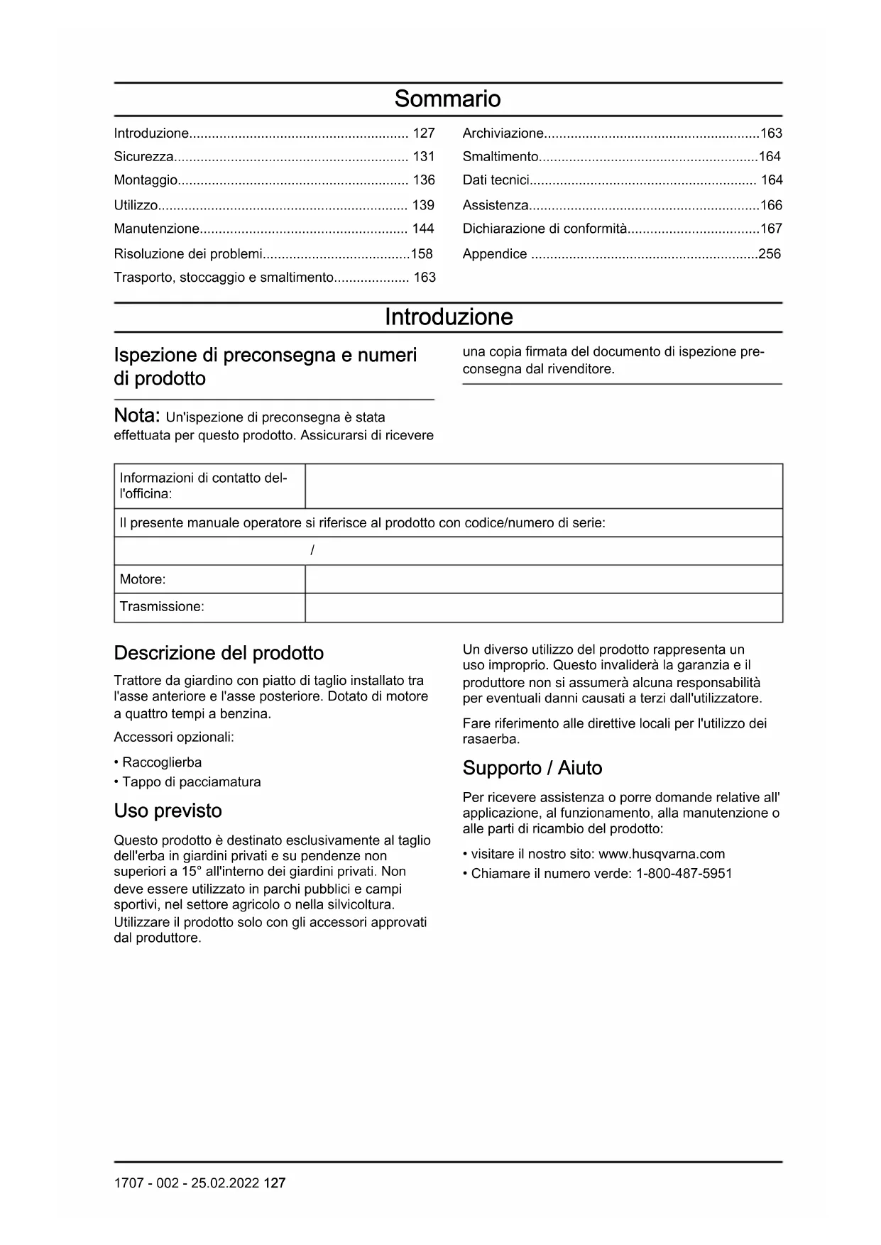 1707 - 002 - 25.02.2022Emissioni Euro V AVVERTENZA: La manomissione del motore rende nulla l'omologazione UE del prodotto. Sicurezza Definizioni di sicurezza Le avvertenze, le precauzioni e le note sono utilizzate per evidenziare le parti importanti del manuale. AVVERTENZA: Utilizzato se è presente un rischio di lesioni o morte dell'operatore o di passanti nel caso in cui le istruzioni del manuale non vengano rispettate. ATTENZIONE: Utilizzato se è presente un rischio di danni al prodotto, ad altri materiali oppure alla zona adiacente nel caso in cui le istruzioni del manuale non vengano rispettate. Nota: Utilizzato per fornire ulteriori informazioni necessarie in una determinata situazione. Norme di sicurezza per i trattori rasaerba AVVERTENZA: Il prodotto ha una potenza sufficiente per amputare mani o piedi e scagliare violentemente gli oggetti. La mancata osservanza delle seguenti norme di sicurezza può essere causa di lesioni gravi o addirittura mortali. AVVERTENZA: Scollegare sempre il cavo candela e collocarlo dove non possa venire a contatto con quest'ultima per non provocare inavvertitamente l’accensione durante la preparazione, il trasporto, la regolazione o la riparazione. AVVERTENZA: Non percorrere tratti in discesa in folle, perché si potrebbe perdere il controllo del trattore. AVVERTENZA: Trainare solo accessori consigliati dal costruttore del trattore e conformi alle specifiche. Durante il traino, usare buon senso. Azionare solo alla velocità più bassa possibile su una pendenza. Su una pendenza, un carico troppo pesante è pericoloso. Gli pneumatici possono perdere trazione col terreno e causare la perdita di controllo del trattore. AVVERTENZA: I gas di scarico, alcuni loro componenti e determinati componenti del veicolo contengono o emettono sostanze chimiche ritenute dallo Stato della California causa di cancro, difetti congeniti o altri danni al sistema riproduttivo.