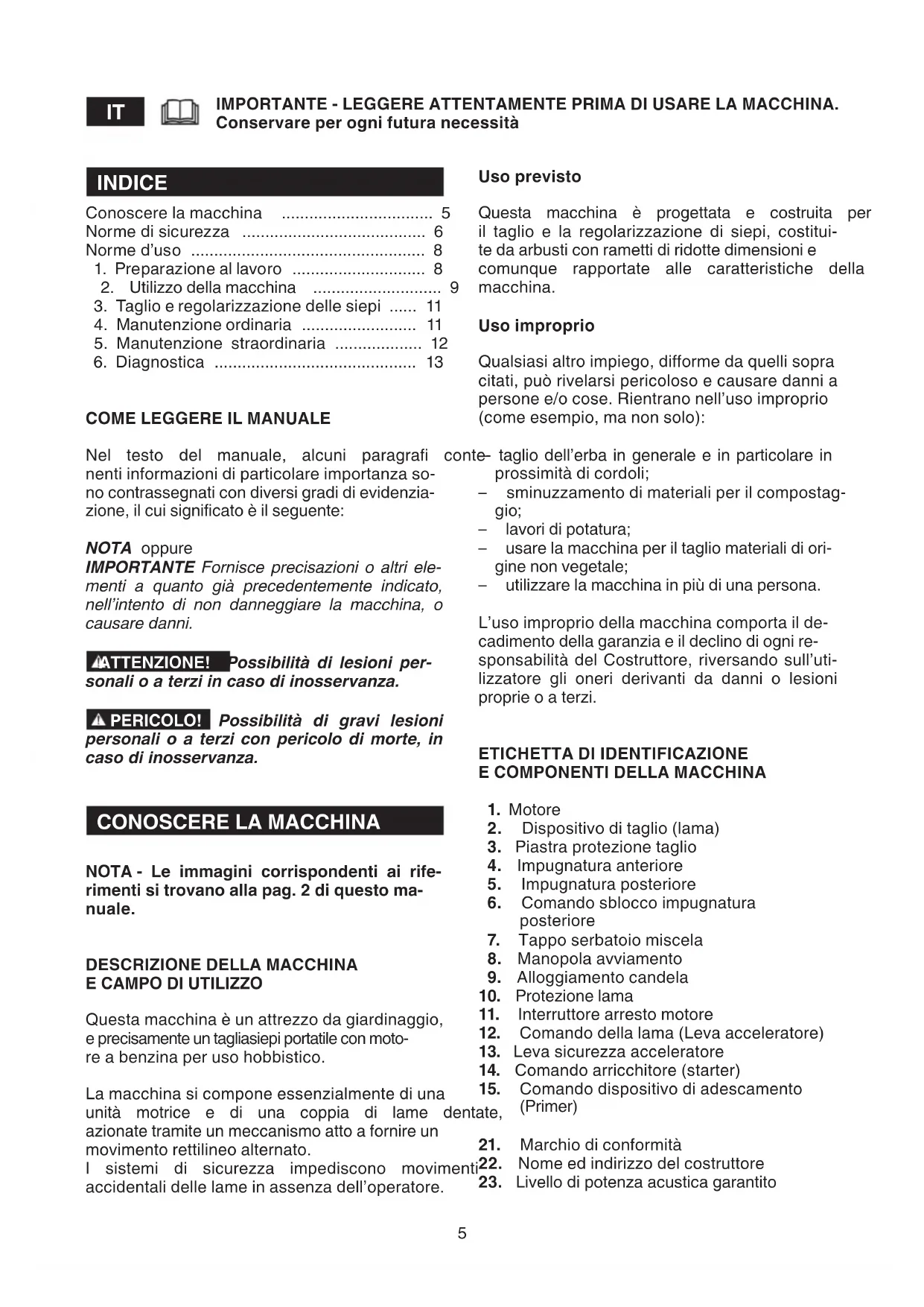 IMPORTANTE - LEGGERE ATTENTAMENTE PRIMA DI USARE LA MACCHINA. Conservare per ogni futura necessità Uso previsto Questa macchina è progettata e costruita per il taglio e la regolarizzazione di siepi, costitui- te da arbusti con rametti di ridotte dimensioni e comunque rapportate alle caratteristiche della macchina. Uso improprio Qualsiasi altro impiego, diorme da quelli sopra citati, può rivelarsi pericoloso e causare danni a persone e/o cose. Rientrano nell’uso improprio (come esempio, ma non solo): – taglio dell’erba in generale e in particolare in prossimità di cordoli; – sminuzzamento di materiali per il compostag- gio; – lavori di potatura; – usare la macchina per il taglio materiali di ori- gine non vegetale; – utilizzare la macchina in più di una persona. L’uso improprio della macchina comporta il de- cadimento della garanzia e il declino di ogni re- sponsabilità del Costruttore, riversando sull’uti- lizzatore gli oneri derivanti da danni o lesioni proprie o a terzi.