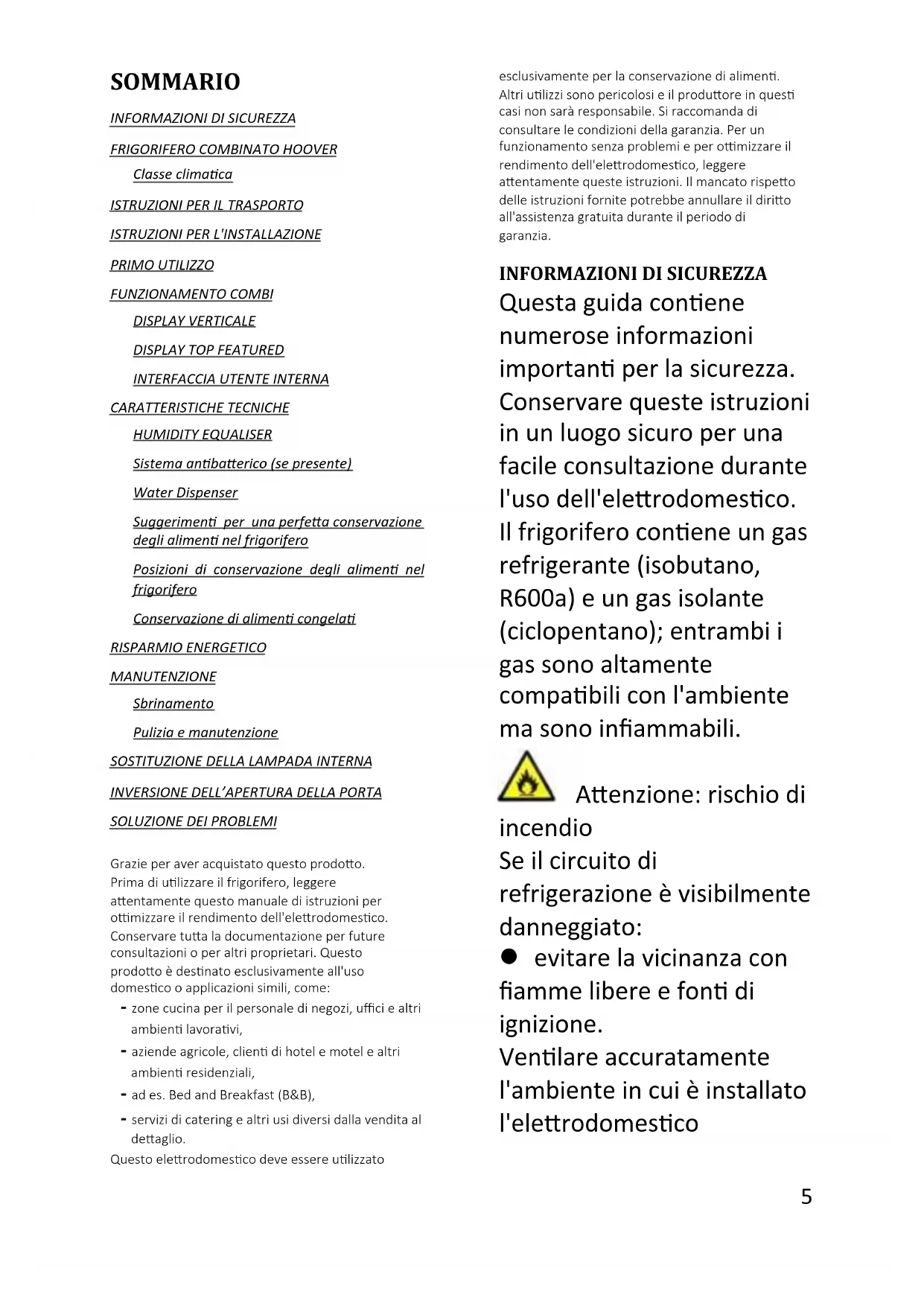 Questa guida contiene numerose informazioni importanti per la sicurezza. Conservare queste istruzioni in un luogo sicuro per una facile consultazione durante l'uso dell'elettrodomestico. Il frigorifero contiene un gas refrigerante (isobutano, R600a) e un gas isolante (ciclopentano); entrambi i gas sono altamente compatibili con l'ambiente ma sono infiammabili. Attenzione: rischio di incendio Se il circuito di refrigerazione è visibilmente danneggiato: evitare la vicinanza con fiamme libere e fonti di ignizione. Ventilare accuratamente l'ambiente in cui è installato l'elettrodomesticoo di 3e 156 AVVERTENZA! Durate le operazioni di pulizia o trasporto dell'elettrodomestico, fare attenzione a non toccare i cavi metallici del condensatore sul retro dell'elettrodomestico per evitare di ferirsi le dita e le mani o di danneggiare il prodotto. Questo elettrodomestico non può essere impilato con altri elettrodomestici. Non sedersi né salire sull'elettrodomestico. Non è progettato per simili utilizzi. Ci si potrebbe ferire o l'elettrodomestico potrebbe danneggiarsi. Accertarsi che il cavo di alimentazione non resti impigliato sotto l'apparecchiatura per evitare che si laceri o si danneggi. Quando l'elettrodomestico viene posizionato, fare attenzione a non danneggiare il pavimento, i tubi, il rivestimento delle pareti ecc. Non spostare l'elettrodomestico tirandolo per il coperchio o per la maniglia. Non consentire ai bambini di giocare con l'apparecchio o manomettere i controlli. In caso di inosservanza delle istruzioni, l'azienda declina qualunque responsabilità. Non installare l'elettrodomestico in luoghi umidi, unti o polverosi, e non esporlo all'acqua e alla luce solare diretta. Non installare l'elettrodomestico accanto a caloriferi o materiali infiammabili. In caso di interruzione della corrente, non aprire il coperchio. Se il blackout non supera le 20 ore, gli alimenti congelati non dovrebbero subire alterazioni. Se l'interruzione della7 corrente dura di più, controllare il cibo e consumarlo immediatamente o ricongelarlo solo dopo averlo cotto. Se il coperchio del congelatore orizzontale non si riapre facilmente subito dopo che è stato chiuso, non si tratta di un problema, in quanto tale condizione dipende dalla differenza di pressione che si bilancerà entro pochi minuti consentendo nuovamente l'apertura del coperchio. Collegare l'elettrodomestico all'alimentazione elettrica solo dopo aver tolto l'imballo e le protezioni per il trasporto. Prima di accendere l'elettrodomestico, attendere almeno 4 ore per consentire all'olio del compressore di assestarsi nel caso in cui l'elettrodomestico sia stato trasportato in posizione orizzontale. Utilizzare il congelatore solo per gli scopi previsti, ossia la conservazione e il congelamento di alimenti. Non conservare medicinali o materiali di ricerca nelle cantinette. Non conservare medicinali o materiali di ricerca che richiedano un controllo rigido della temperatura di conservazione, in quanto potrebbero deteriorarsi e provocare reazioni incontrollate e pericolose. Prima di qualunque intervento, scollegare il cavo di alimentazione dalla presa elettrica. Quando il prodotto viene consegnato, accertarsi che non sia danneggiato e che tutti i componenti e gli accessori siano in perfette condizioni. In caso di perdita nell'impianto di refrigerazione, non8 toccare la presa di corrente ed evitare l'uso di fiamme libere. Aprire la finestra e arieggiare l'ambiente. Rivolgersi al centro assistenza per chiedere la riparazione. Non adoperare adattatori né cavi di prolunga. Non tirare o piegare eccessivamente il cavo di alimentazione e non toccare la spina con le mani umide. Per scongiurare il rischio di incendi o scosse elettriche, non danneggiare la spina e/o il cavo di alimentazione. Se il cavo di alimentazione dell’elettrodomestico dovesse essere danneggiato, farlo sostituire dal produttore, dal suo servizio tecnico o da un tecnico qualificato, per evitare rischi. Non collocare o conservare materiali infiammabili o estremamente volatili (ad es. etere, benzina, GPL, propano, bombolette per aerosol, adesivi, alcool puro), in quanto possono provocare esplosioni. Non adoperare né conservare spray infiammabili (ad es. bombolette di vernice spray) accanto alle cantinette, in quanto potrebbero svilupparsi incendi o esplosioni. Non collocare oggetti e/o contenitori pieni d'acqua sopra l'elettrodomestico. Si sconsiglia l'uso di prolunghe e prese multiple. Non smaltire l'elettrodomestico nel fuoco. Fare attenzione a non danneggiare il circuito/i tubi di raffreddamento dell'elettrodomestico durante il trasporto e l'uso. In caso di danni, non esporre l'elettrodomestico al fuoco o a potenziali fonti di ignizione, e ventilare9 immediatamente l'ambiente in cui è installato. L'impianto di refrigerazione collocato nella parte posteriore e nella parte interna delle cantinette contiene refrigerante, per cui occorre particolare attenzione a non danneggiare i tubi. Non adoperare apparecchiature elettriche all'interno dei comparti dell'elettrodomestico destinati alla conservazione degli alimenti, a meno che non siano del tipo consigliato dal produttore. Non danneggiare il circuito di refrigerazione. Non usare oggetti meccanici o utensili diversi da quelli consigliati dal produttore per accelerare lo sbrinamento. Non adoperare apparecchiature elettriche all'interno dei comparti per la conservazione degli alimenti, a meno che non siano del tipo consigliato dal produttore. Tenere libere da ostruzioni le aperture di ventilazione sull'involucro del frigorifero. Non toccare gli elementi di raffreddamento interni, soprattutto con le mani bagnate, per evitare bruciature o lesioni. Non adoperare oggetti appuntiti o affilati (ad es. coltelli o forchette) per rimuovere il ghiaccio. Non utilizzare asciugacapelli, stufe o apparecchi simili per lo sbrinamento. Non adoperare coltelli o oggetti appuntiti per rimuovere brina o ghiaccio. Il circuito del refrigerante potrebbe danneggiarsi