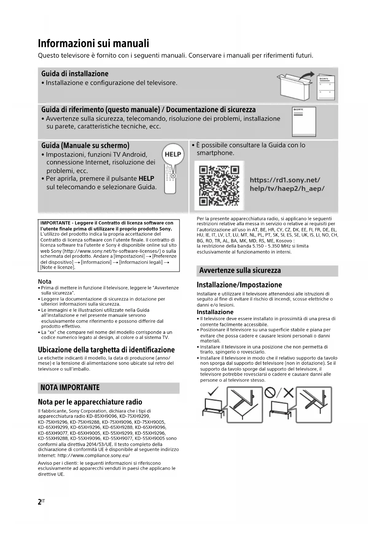 - Prima di mettere in funzione il televisore, leggere le “Avvertenze sulla sicurezza”.• Leggere la documentazione di sicurezza in dotazione per ulteriori informazioni sulla sicurezza.• Le immagini e le illustrazioni utilizzate nella Guida all’installazione e nel presente manuale servono esclusivamente come riferimento e possono differire dal prodotto effettivo.• La “xx” che compare nel nome del modello corrisponde a un codice numerico legato al design, al colore o al sistema TV. Ubicazione della targhetta di identificazione Le etichette indicanti il modello, la data di produzione (anno/mese) e la tensione di alimentazione sono ubicate sul retro del televisore o sull’imballo. NOTA IMPORTANTE Nota per le apparecchiature radio Il fabbricante, Sony Corporation, dichiara che i tipi di apparecchiatura radio KD-85XH9096, KD-75XH9299, KD-75XH9296, KD-75XH9288, KD-75XH9096, KD-75XH9005, KD-65XH9299, KD-65XH9296, KD-65XH9288, KD-65XH9096, KD-65XH9077, KD-65XH9005, KD-55XH9299, KD-55XH9296, KD-55XH9288, KD-55XH9096, KD-55XH9077, KD-55XH9005 sono conformi alla direttiva 2014/53/UE. Il testo completo della dichiarazione di conformità UE è disponibile al seguente indirizzo Internet: http://www.compliance.sony.eu/Avviso per i clienti: le seguenti informazioni si riferiscono esclusivamente ad apparecchi venduti in paesi che applicano le direttive UE.Per la presente apparecchiatura radio, si applicano le seguenti restrizioni relative alla messa in servizio o relative ai requisiti per l’autorizzazione all’uso in AT, BE, HR, CY, CZ, DK, EE, FI, FR, DE, EL, HU, IE, IT, LV, LT, LU, MT, NL, PL, PT, SK, SI, ES, SE, UK, IS, LI, NO, CH, BG, RO, TR, AL, BA, MK, MD, RS, ME, Kosovo :la restrizione della banda 5.150 - 5.350 MHz si limita esclusivamente al funzionamento in interni. Avvertenze sulla sicurezza Installazione/Impostazione Installare e utilizzare il televisore attenendosi alle istruzioni di seguito al fine di evitare il rischio di incendi, scosse elettriche o danni e/o lesioni. Installazione