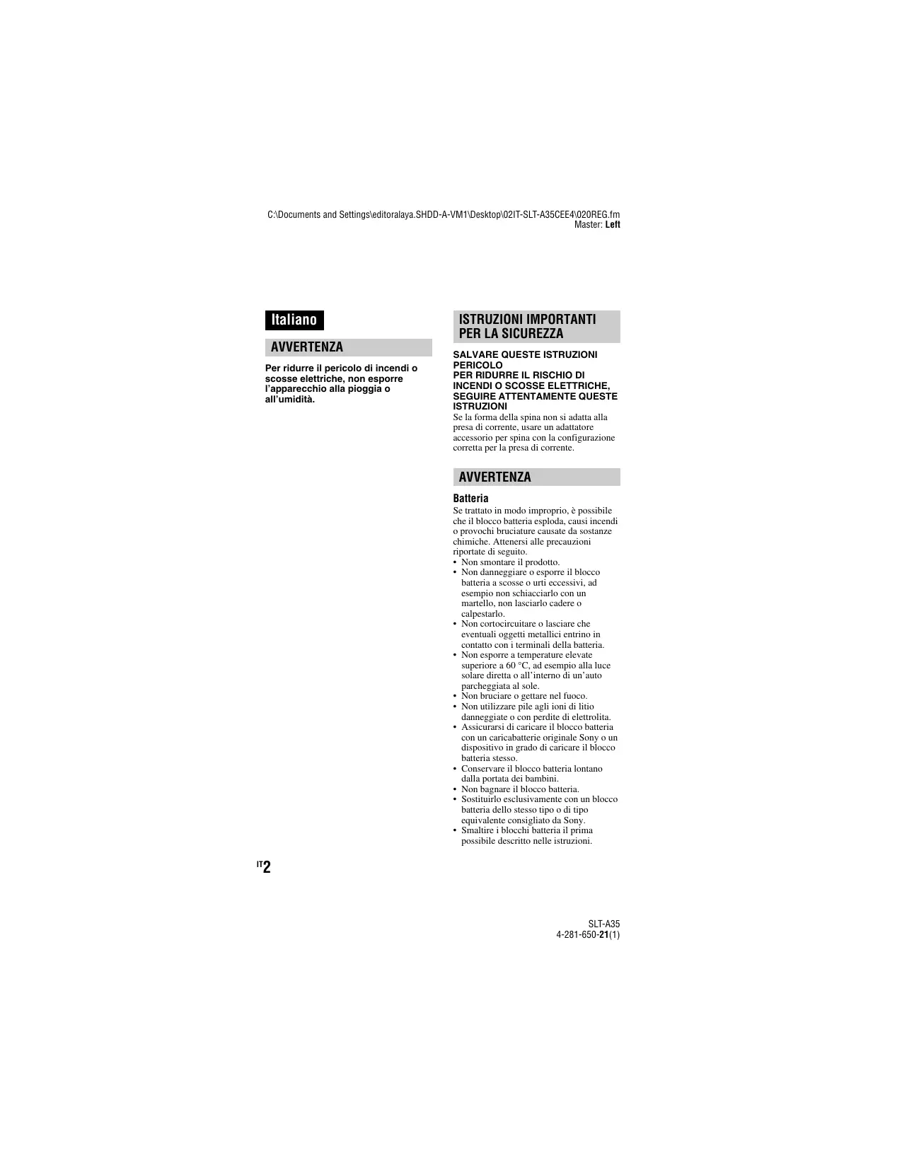 - SLT-A35 4-281-650-21(1) C:\Documents and Settings\editoralaya.SHDD-A-VM1\Desktop\02IT-SLTA35CEE4\010COVTOC.fm Master: Right Indice Note sull’uso della fotocamera p. 5