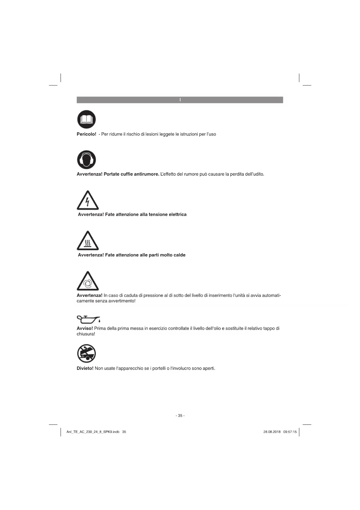 Avvertenza! Portate cuffi e antirumore. L’e ff etto del rumore può causare la perdita dell’udito. Pericolo! - Per ridurre il rischio di lesioni leggete le istruzioni per l’uso Avvertenza! Fate attenzione alla tensione elettrica Avvertenza! Fate attenzione alle parti molto calde Avvertenza! In caso di caduta di pressione al di sotto del livello di inserimento l‘unità si avvia automati- camente senza avvertimento! Avviso! Prima della prima messa in esercizio controllate il livello dell‘olio e sostituite il relativo tappo di chiusura! Divieto! Non usate l‘apparecchio se i portelli o l‘involucro sono aperti. Anl_TE_AC_230_24_8_SPK9.indb 35Anl_TE_AC_230_24_8_SPK9.indb 35 28.08.2018 09:57:1528.08.2018 09:57:15I