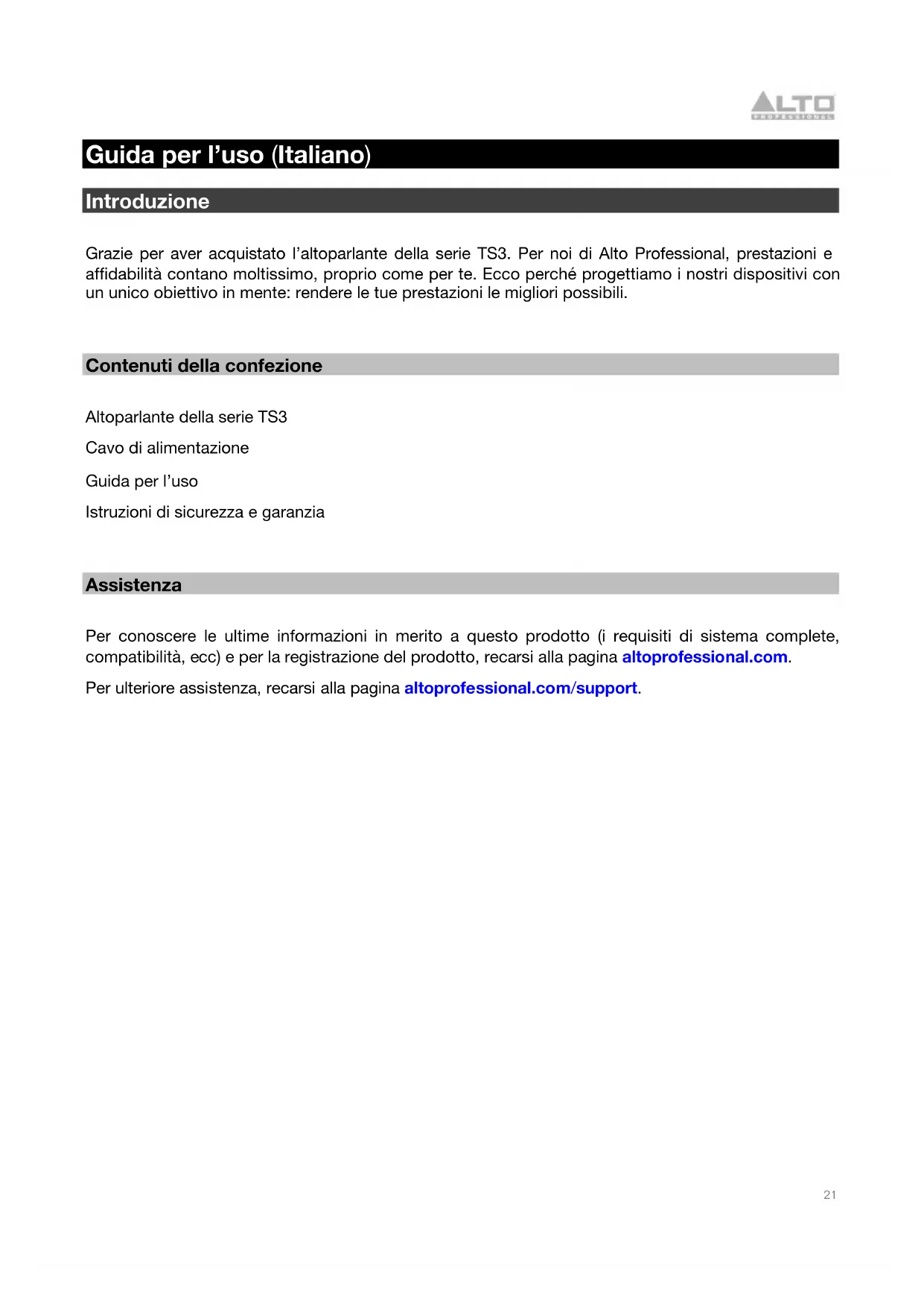Guida per l’uso (Italiano) Introduzione Grazie per aver acquistato l’altoparlante della serie TS3. Per noi di Alto Professional, prestazioni e affidabilità contano moltissimo, proprio come per te. Ecco perché progettiamo i nostri dispositivi con un unico obiettivo in mente: rendere le tue prestazioni le migliori possibili.