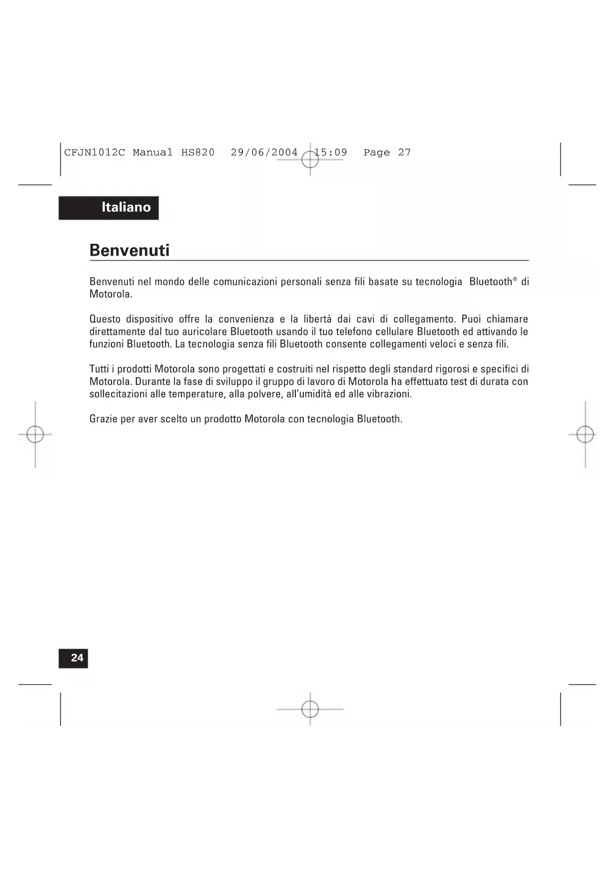 CFJN1012C Manual HS820 29/06/2004 15:09 Page 2725 Italiano Sicurezza ed informazioni generali INFORMAZIONI IMPORTANTI SULLA SICUREZZA E SULLA EFFICIENZA DELLE OPERAZIONI COLLEGATE. LEGGERE ATTENTAMENTE PRIMA DELL’USO. Agli utenti non è consentito apportare alcun tipo di cambiamento o modifica al dispositivo. Cambiamenti o modifiche non espressamente approvati dalla controparte responsabile per la compatibilità potrebbero invalidare il diritto dell’utente di utilizzare l’apparecchiatura. Fare riferimento alla normativa 47 CFR Sec. 15.21. Questo dispositivo è conforme alle specifiche descritte nella parte 15 delle norme FCC e allo standard RSS-210 / RSS – 139 di Industry Canada. Il funzionamento è soggetto alle due condizioni riportate di seguito: (1) Il dispositivo non può causare interferenze dannose e (2) deve accettare eventuali interferenze anche se possono causare un funzionamento indesiderato. Vedere la normativa 47 CFR Sec. 15.19(3). Direttive di conformità dell’Unione Europea Con la presente Motorola dichiara che questo prodotto (“HS820”) è conforme a quanto riportato di seguito: