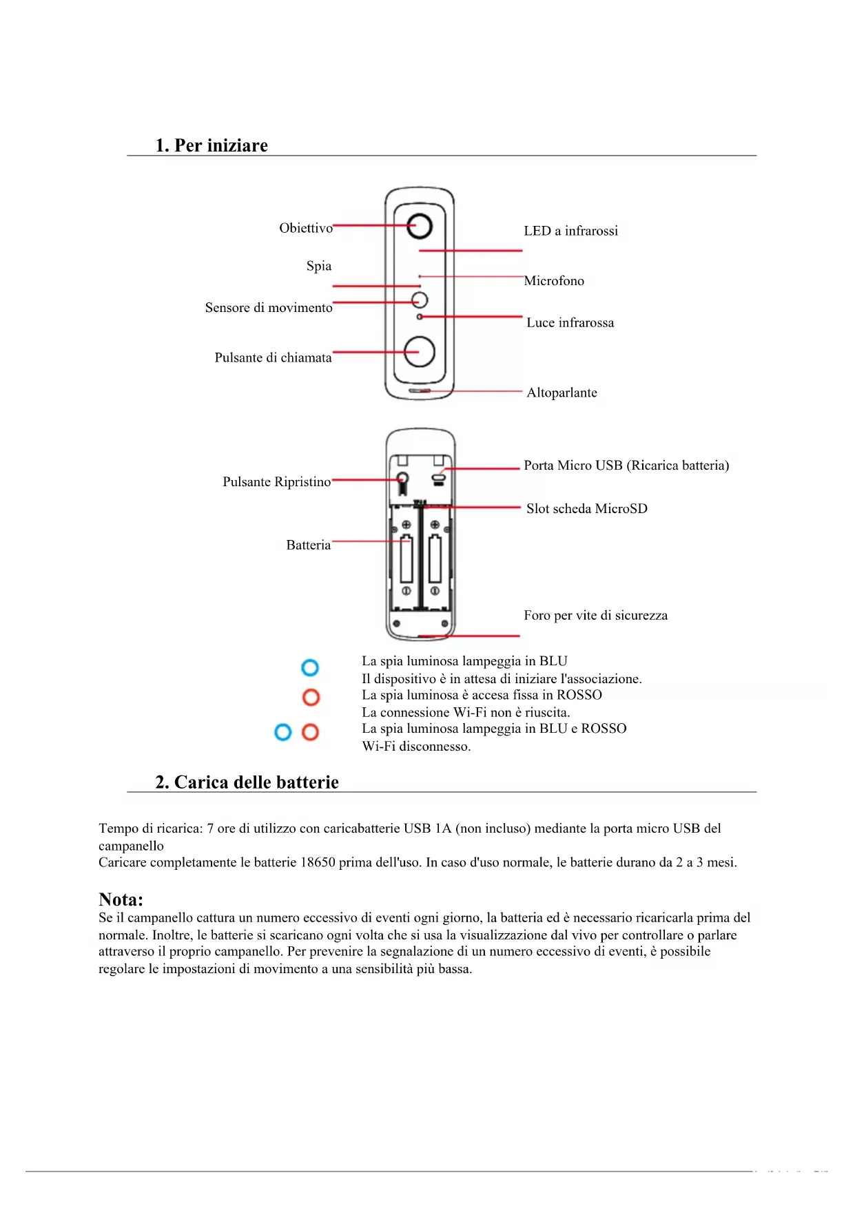 Tempo di ricarica: 7 orc di utilizzo con caricabatterie USB 1A (non incluso) mediante la porta micro USB del campanello
