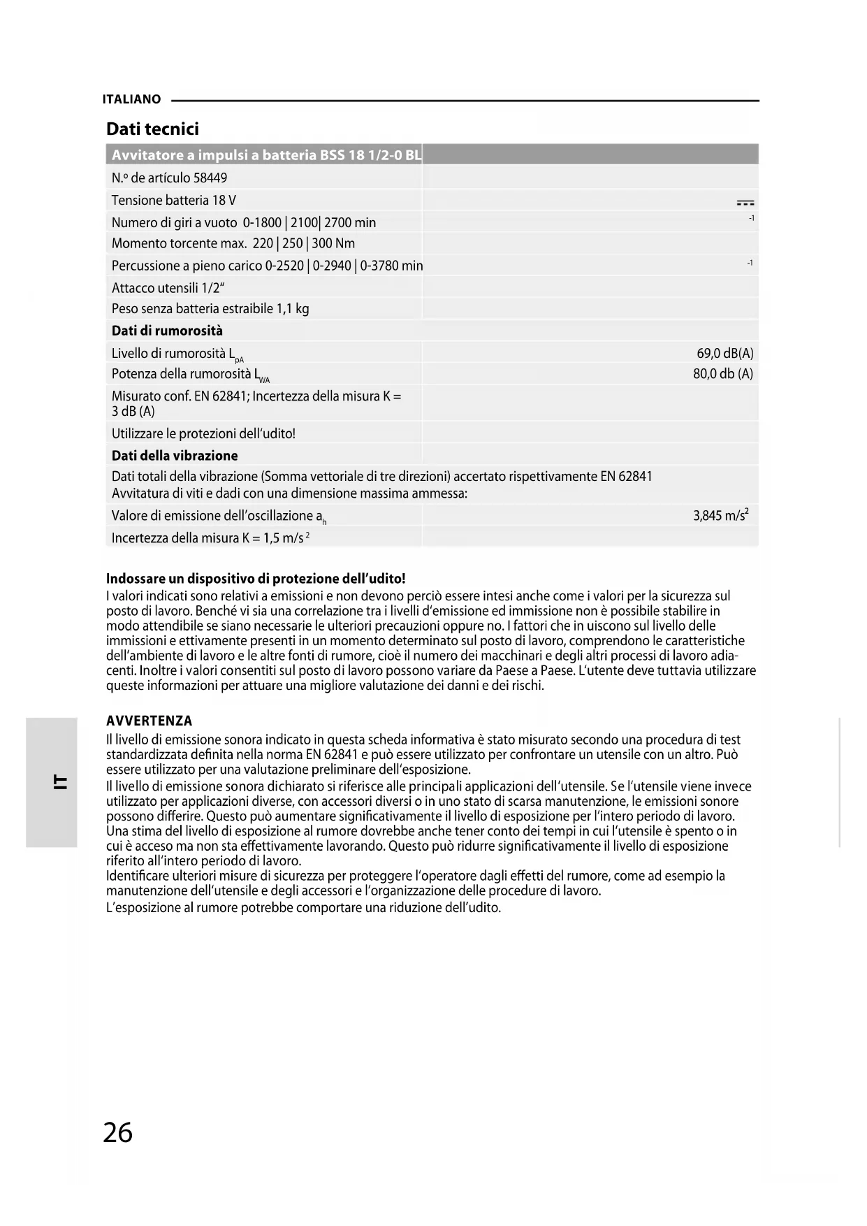 Indossare un dispositivo di protezione dell’udito! I valori indicati sono relativi a emissioni e non devono perciò essere intesi anche come i valori per la sicurezza sul posto di lavoro. Benché vi sia una correlazione tra i livelli d‘emissione ed immissione non è possibile stabilire in modo attendibile se siano necessarie le ulteriori precauzioni oppure no. I fattori che in uiscono sul livello delle immissioni e ettivamente presenti in un momento determinato sul posto di lavoro, comprendono le caratteristiche dell‘ambiente di lavoro e le altre fonti di rumore, cioè il numero dei macchinari e degli altri processi di lavoro adia- centi. Inoltre i valori consentiti sul posto di lavoro possono variare da Paese a Paese. L‘utente deve tuttavia utilizzare queste informazioni per attuare una migliore valutazione dei danni e dei rischi. AVVERTENZA Il livello di emissione sonora indicato in questa scheda informativa è stato misurato secondo una procedura di test standardizzata denita nella norma EN 62841 e può essere utilizzato per confrontare un utensile con un altro. Può essere utilizzato per una valutazione preliminare dell‘esposizione. Il livello di emissione sonora dichiarato si riferisce alle principali applicazioni dell‘utensile. Se l‘utensile viene invece utilizzato per applicazioni diverse, con accessori diversi o in uno stato di scarsa manutenzione, le emissioni sonore possono dierire. Questo può aumentare signicativamente il livello di esposizione per l‘intero periodo di lavoro. Una stima del livello di esposizione al rumore dovrebbe anche tener conto dei tempi in cui l‘utensile è spento o in cui è acceso ma non sta eettivamente lavorando. Questo può ridurre signicativamente il livello di esposizione riferito all‘intero periodo di lavoro. Identicare ulteriori misure di sicurezza per proteggere l‘operatore dagli eetti del rumore, come ad esempio la manutenzione dell‘utensile e degli accessori e l‘organizzazione delle procedure di lavoro. L’esposizione al rumore potrebbe comportare una riduzione dell’udito. IT26 27