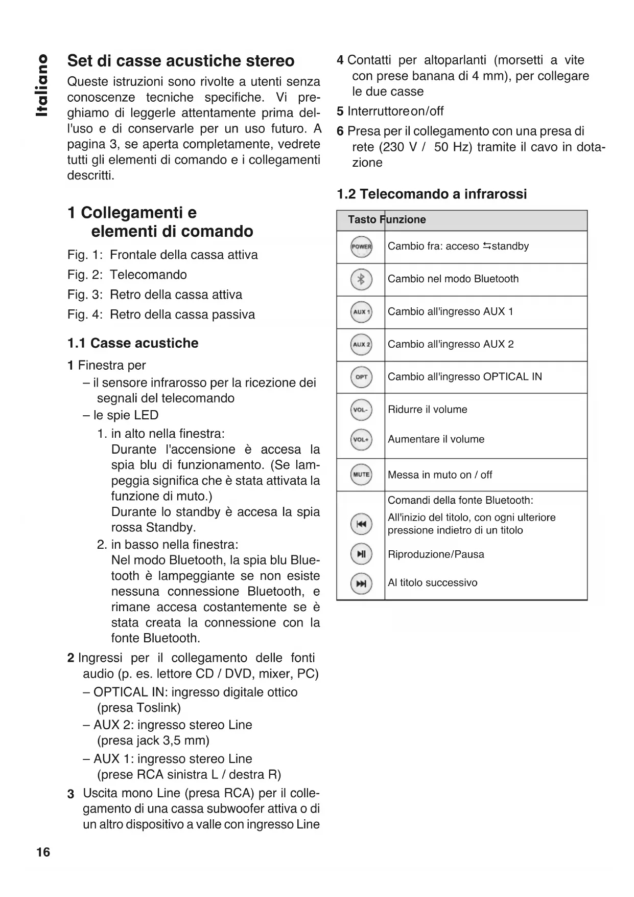 Set di casse acustiche stereo Queste istruzioni sono rivolte a utenti senza conoscenze tecniche specifiche. Vi pre- ghiamo di leggerle attentamente prima del- l'uso e di conservarle per un uso futuro. A pagina 3, se aperta completamente, vedrete tutti gli elementi di comando e i collegamenti descritti. 1 Collegamenti e elementi di comando Fig. 1: Frontale della cassa attiva Fig. 2: Telecomando Fig. 3: Retro della cassa attiva Fig. 4: Retro della cassa passiva
