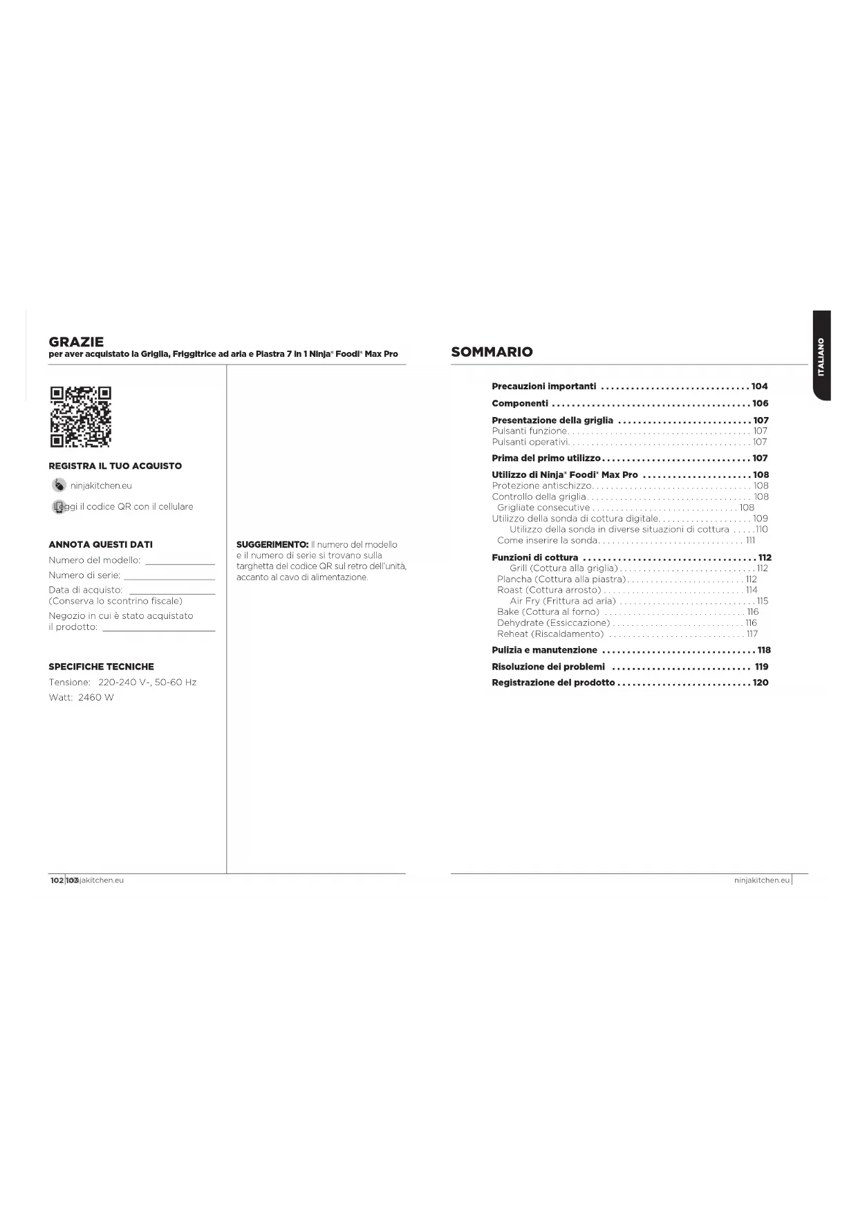 - fournies avec votre appareil.102 103 ninjakitchen.eu ninjakitchen.eu SOMMARIO GRAZIE per aver acquistato la Griglia, Friggitrice ad aria e Piastra 7 in 1 Ninja® Foodi® Max Pro Precauzioni importanti p. 104