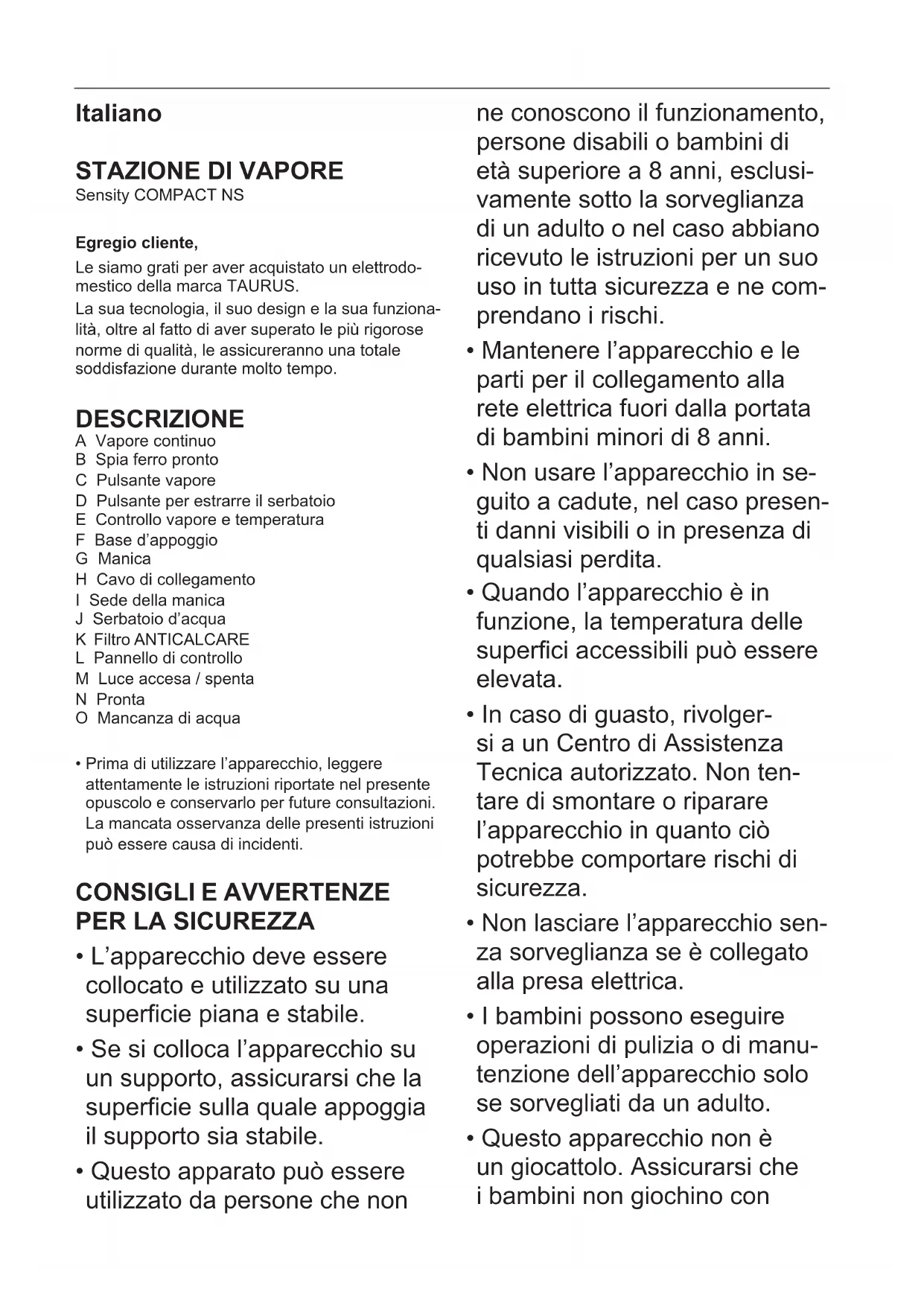 Sensity COMPACT NS Egregio cliente, Le siamo grati per aver acquistato un elettrodo- mestico della marca TAURUS. La sua tecnologia, il suo design e la sua funziona- lità, oltre al fatto di aver superato le più rigorose norme di qualità, le assicureranno una totale soddisfazione durante molto tempo. DESCRIZIONE A Vapore continuo B Spia ferro pronto C Pulsante vapore D Pulsante per estrarre il serbatoio E Controllo vapore e temperatura F Base d’appoggio G Manica H Cavo di collegamento I Sede della manica J Serbatoio d’acqua K Filtro ANTICALCARE L Pannello di controllo M Luce accesa / spenta N Pronta O Mancanza di acqua