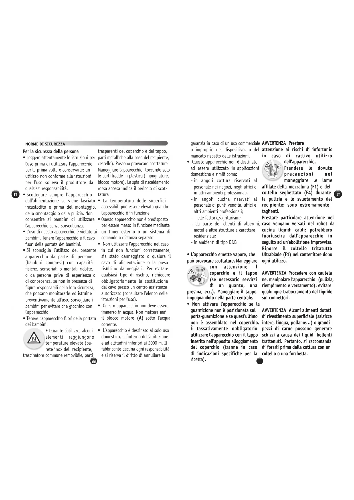 trasparenti del coperchio e del tappo, parti metalliche alla base del recipiente, cestello). Posso sono provocare scottature. Maneggiare l'apparecchio toccando solo le parti fredde in plastica (impugnature, blocco motore). La spia di riscaldamento rossa accesa indica il pericolo di scottature.