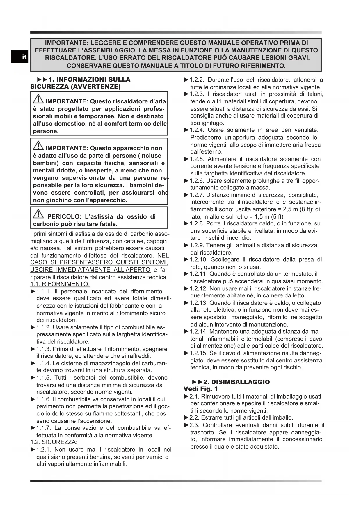 zhIMPORTANTE: LEGGERE E COMPRENDERE QUESTO MANUALE OPERATIVO PRIMA DI EFFETTUARE L’ASSEMBLAGGIO, LA MESSA IN FUNZIONE O LA MANUTENZIONE DI QUESTO RISCALDATORE. L’USO ERRATO DEL RISCALDATORE PUÒ CAUSARE LESIONI GRAVI. CONSERVARE QUESTO MANUALE A TITOLO DI FUTURO RIFERIMENTO. ►►1. INFORMAZIONI SULLA SICUREZZA (AVVERTENZE) IMPORTANTE: Questo riscaldatore d’aria è stato progettato per applicazioni profes- sionali mobili e temporanee. Non è destinato all’uso domestico, né al comfort termico delle persone. IMPORTANTE: Questo apparecchio non è adatto all’uso da parte di persone (incluse bambini) con capacità siche, sensoriali e mentali ridotte, o inesperte, a meno che non vengano supervisionate da una persona re- ponsabile per la loro sicurezza. I bambini de- vono essere controllati, per assicurarsi che non giochino con l’apparecchio. PERICOLO: L’asssia da ossido di carbonio può risultare fatale. I primi sintomi di asssia da ossido di carbonio asso- migliano a quelli dell’inuenza, con cefalee, capogiri e/o nausea. Tali sintomi potrebbero essere causati dal funzionamento difettoso del riscaldatore. NEL CASO SI PRESENTASSERO QUESTI SINTOMI, USCIRE IMMEDIATAMENTE ALL’APERTO e far riparare il riscaldatore dal centro assistenza tecnica. 1.1. RIFORNIMENTO: ►1.1.1. Il personale incaricato del rifornimento, deve essere qualicato ed avere totale dimesti- chezza con le istruzioni del fabbricante e con la normativa vigente in merito al rifornimento sicuro dei riscaldatori. ►1.1.2. Usare solamente il tipo di combustibile es- pressamente specicato sulla targhetta identica- tiva del riscaldatore. ►1.1.3. Prima di eettuare il rifornimento, spegnere il riscaldatore, ed attendere che si rareddi. ►1.1.4. Le cisterne di magazzinaggio del carburan- te devono trovarsi in una struttura separata. ►1.1.5. Tutti i serbatoi del combustibile, devono trovarsi ad una distanza minima di sicurezza dal riscaldatore, secondo norme vigenti. ►1.1.6. Il combustibile va conservato in locali il cui pavimento non permetta la penetrazione ed il goc- ciolio dello stesso su amme sottostanti, che pos- sano causarne l’accensione. ►1.1.7. La conservazione del combustibile va ef- fettuata in conformità alla normativa vigente. 1.2. SICUREZZA: ►1.2.1. Non usare mai il riscaldatore in locali nei quali siano presenti benzina, solventi per vernici o altri vapori altamente inammabili. ►1.2.2. Durante l’uso del riscaldatore, attenersi a tutte le ordinanze locali ed alla normativa vigente. ►1.2.3. I riscaldatori usati in prossimità di teloni, tende o altri materiali simili di copertura, devono essere situati a distanza di sicurezza da essi. Si consiglia anche di usare materiali di copertura di tipo ignifugo. ►1.2.4. Usare solamente in aree ben ventilate. Predisporre un’apertura adeguata secondo le norme vigenti, allo scopo di immettere aria fresca dall’esterno. ►1.2.5. Alimentare il riscaldatore solamente con corrente avente tensione e frequenza specicate sulla targhetta identicativa del riscaldatore. ►1.2.6. Usare solamente prolunghe a tre li oppor- tunamente collegate a massa. ►1.2.7. Distanze minime di sicurezza, consigliate, intercorrente tra il riscaldatore e le sostanze in- ammabili sono: uscita anteriore = 2,5 m (8 ft); di lato, in alto e sul retro = 1,5 m (5 ft). ►1.2.8. Porre il riscaldatore caldo, o in funzione, su una supercie stabile e livellata, in modo da evi- tare i rischi di incendio. ►1.2.9. Tenere gli animali a distanza di sicurezza dal riscaldatore. ►1.2.10. Scollegare il riscaldatore dalla presa di rete, quando non lo si usa. ►1.2.11. Quando è controllato da un termostato, il riscaldatore può accendersi in qualsiasi momento. ►1.2.12. Non usare mai il riscaldatore in stanze fre- quentemente abitate né, in camere da letto. ►1.2.13. Quando il riscaldatore è caldo, o collegato alla rete elettrica, o in funzione non deve mai es- sere spostato, maneggiato, rifornito né soggetto ad alcun intervento di manutenzione. ►1.2.14. Mantenere una adeguata distanza da ma- teriali inammabili, o termolabili (compreso il cavo di alimentezione) dalle parti calde del riscaldatore. ►1.2.15. Se il cavo di alimentazione risulta danneg- giato, deve essere sostituito dal centro assistenza tecnica, in modo da prevenire ogni rischio. ►►2. DISIMBALLAGGIO Vedi Fig. 1 ►2.1. Rimuovere tutti i materiali di imballaggio usati per confezionare e spedire il riscaldatore e smal- tirli secondo le norme vigenti. ►2.2. Estrarre tutti gli articoli dall’imballo. ►2.3. Controllare eventuali danni subiti durante il trasporto. Se il riscaldatore appare danneggia- to, informare immediatamente il concessionario presso il quale è stato acquistato.