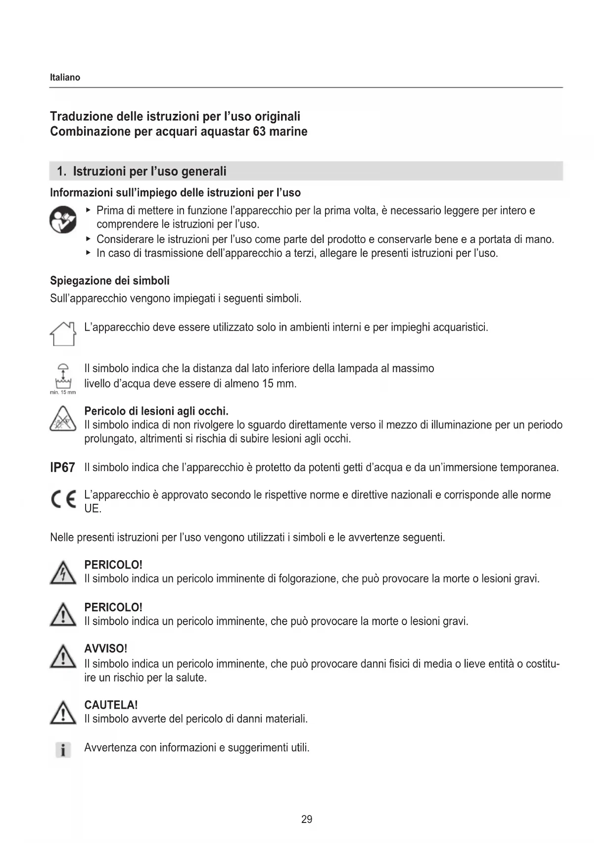Informazioni sull’impiego delle istruzioni per l’uso ▶ Prima di mettere in funzione l’apparecchio per la prima volta, è necessario leggere per intero e comprendere le istruzioni per l’uso. ▶ Considerare le istruzioni per l’uso come parte del prodotto e conservarle bene e a portata di mano. ▶ In caso di trasmissione dell’apparecchio a terzi, allegare le presenti istruzioni per l’uso. Spiegazione dei simboli Sull’apparecchio vengono impiegati i seguenti simboli. L’apparecchio deve essere utilizzato solo in ambienti interni e per impieghi acquaristici. Il simbolo indica che la distanza dal lato inferiore della lampada al massimo livello d’acqua deve essere di almeno 15 mm. Pericolo di lesioni agli occhi. Il simbolo indica di non rivolgere lo sguardo direttamente verso il mezzo di illuminazione per un periodo prolungato, altrimenti si rischia di subire lesioni agli occhi. Il simbolo indica che l’apparecchio è protetto da potenti getti d’acqua e da un’immersione temporanea. L’apparecchio è approvato secondo le rispettive norme e direttive nazionali e corrisponde alle norme UE. Nelle presenti istruzioni per l’uso vengono utilizzati i simboli e le avvertenze seguenti. PERICOLO! Il simbolo indica un pericolo imminente di folgorazione, che può provocare la morte o lesioni gravi. PERICOLO! Il simbolo indica un pericolo imminente, che può provocare la morte o lesioni gravi. AVVISO! Il simbolo indica un pericolo imminente, che può provocare danni sici di media o lieve entità o costitu- ire un rischio per la salute. CAUTELA! Il simbolo avverte del pericolo di danni materiali. Avvertenza con informazioni e suggerimenti utili. min. 15 mm IP6730 Italiano Convenzioni di rappresentazione Rimando a una gura, qui rimando alla gura A Viene richiesta un’azione da parte vostra.