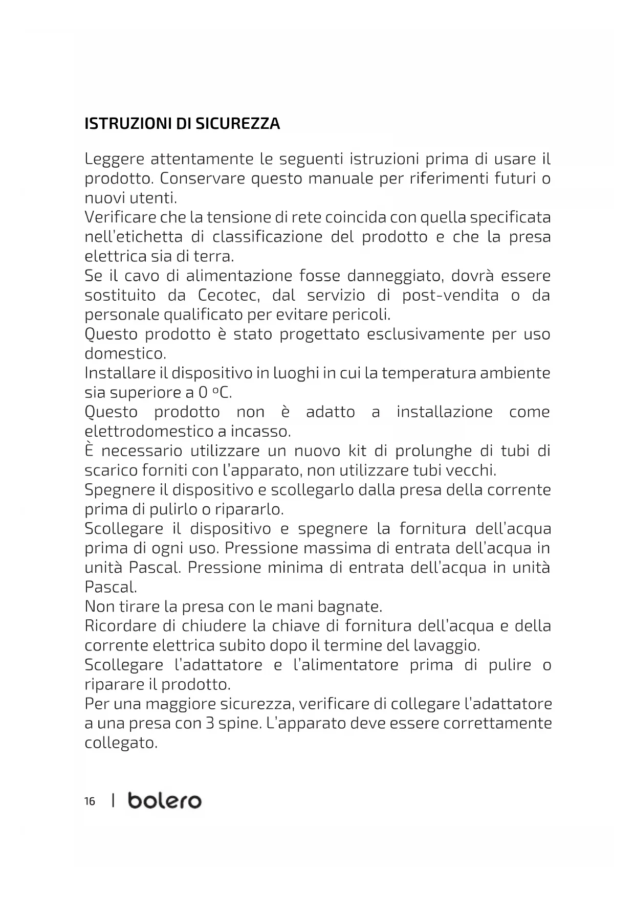 Leggere attentamente le seguenti istruzioni prima di usare il prodotto. Conservare questo manuale per riferimenti futuri o nuovi utenti. Verificare che la tensione di rete coincida con quella specificata nell’etichetta di classificazione del prodotto e che la presa elettrica sia di terra. Se il cavo di alimentazione fosse danneggiato, dovrà essere sostituito da Cecotec, dal servizio di post-vendita o da personale qualificato per evitare pericoli. Questo prodotto è stato progettato esclusivamente per uso domestico. Installare il dispositivo in luoghi in cui la temperatura ambiente sia superiore a 0 ºC. Questo prodotto non è adatto a installazione come elettrodomestico a incasso. È necessario utilizzare un nuovo kit di prolunghe di tubi di scarico forniti con l’apparato, non utilizzare tubi vecchi. Spegnere il dispositivo e scollegarlo dalla presa della corrente prima di pulirlo o ripararlo. Scollegare il dispositivo e spegnere la fornitura dell’acqua prima di ogni uso. Pressione massima di entrata dell’acqua in unità Pascal. Pressione minima di entrata dell’acqua in unità Pascal. Non tirare la presa con le mani bagnate. Ricordare di chiudere la chiave di fornitura dell’acqua e della corrente elettrica subito dopo il termine del lavaggio. Scollegare l’adattatore e l’alimentatore prima di pulire o riparare il prodotto. Per una maggiore sicurezza, verificare di collegare l’adattatore a una presa con 3 spine. L’apparato deve essere correttamente collegato. IM 02317 02322 02327 02332 02319 02324 02328 02333 Lavadora Bolero DressCode_IC_YV_02210311.indd 16IM 02317 02322 02327 02332 02319 02324 02328 02333 Lavadora Bolero DressCode_IC_YV_02210311.indd 16 11/3/21 17:2411/3/21 17:2417 DRESSCODE 7200 / 8200 / 9200 / 10200 INVERTER