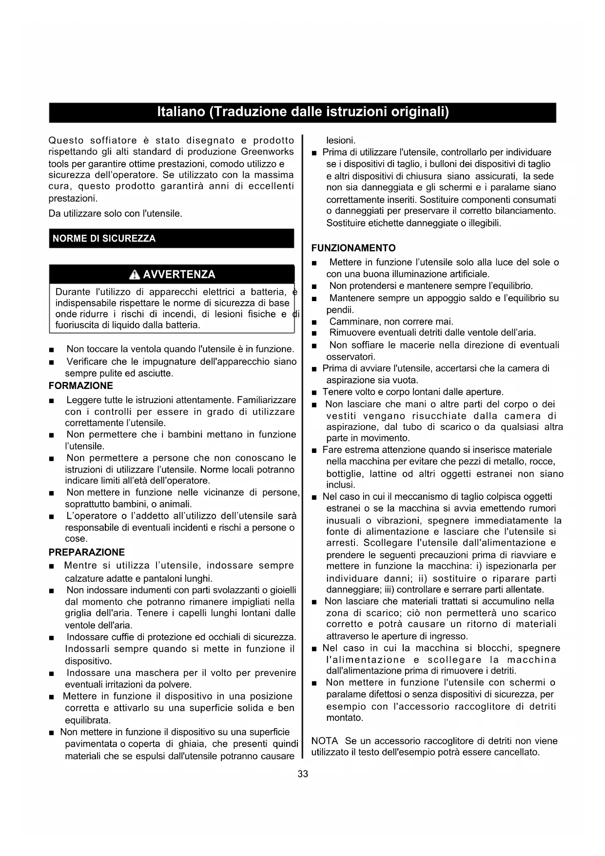 AVVERTENZA Durante l'utilizzo di apparecchi elettrici a batteria, è indispensabile rispettare le norme di sicurezza di base onde ridurre i rischi di incendi, di lesioni fisiche e di fuoriuscita di liquido dalla batteria. ■ Non toccare la ventola quando l'utensile è in funzione. ■ Verificare che le impugnature dell'apparecchio siano sempre pulite ed asciutte. FORMAZIONE ■ Leggere tutte le istruzioni attentamente. Familiarizzare con i controlli per essere in grado di utilizzare correttamente l’utensile. ■ Non permettere che i bambini mettano in funzione l’utensile. ■ Non permettere a persone che non conoscano le istruzioni di utilizzare l’utensile. Norme locali potranno indicare limiti all’età dell’operatore. ■ Non mettere in funzione nelle vicinanze di persone, soprattutto bambini, o animali. ■ L’operatore o l’addetto all’utilizzo dell’utensile sarà responsabile di eventuali incidenti e rischi a persone o cose. PREPARAZIONE ■ Mentre si utilizza l’utensile, indossare sempre calzature adatte e pantaloni lunghi. ■ Non indossare indumenti con parti svolazzanti o gioielli dal momento che potranno rimanere impigliati nella griglia dell'aria. Tenere i capelli lunghi lontani dalle ventole dell'aria. ■ Indossare cuffie di protezione ed occhiali di sicurezza. Indossarli sempre quando si mette in funzione il dispositivo. ■ Indossare una maschera per il volto per prevenire eventuali irritazioni da polvere. ■ Mettere in funzione il dispositivo in una posizione corretta e attivarlo su una superficie solida e ben equilibrata. ■ Non mettere in funzione il dispositivo su una superficie pavimentata o coperta di ghiaia, che presenti quindi materiali che se espulsi dall'utensile potranno causare lesioni. ■ Prima di utilizzare l'utensile, controllarlo per individuare se i dispositivi di taglio, i bulloni dei dispositivi di taglio e altri dispositivi di chiusura siano assicurati, la sede non sia danneggiata e gli schermi e i paralame siano correttamente inseriti. Sostituire componenti consumati o danneggiati per preservare il corretto bilanciamento. Sostituire etichette danneggiate o illegibili. FUNZIONAMENTO ■ Mettere in funzione l’utensile solo alla luce del sole o con una buona illuminazione artificiale. ■ Non protendersi e mantenere sempre l’equilibrio. ■ Mantenere sempre un appoggio saldo e l’equilibrio su pendii. ■ Camminare, non correre mai. ■ Rimuovere eventuali detriti dalle ventole dell’aria. ■ Non soffiare le macerie nella direzione di eventuali osservatori. ■ Prima di avviare l'utensile, accertarsi che la camera di aspirazione sia vuota. ■ Tenere volto e corpo lontani dalle aperture. ■ Non lasciare che mani o altre parti del corpo o dei vestiti vengano risucchiate dalla camera di aspirazione, dal tubo di scarico o da qualsiasi altra parte in movimento. ■ Fare estrema attenzione quando si inserisce materiale nella macchina per evitare che pezzi di metallo, rocce, bottiglie, lattine od altri oggetti estranei non siano inclusi. ■ Nel caso in cui il meccanismo di taglio colpisca oggetti estranei o se la macchina si avvia emettendo rumori inusuali o vibrazioni, spegnere immediatamente la fonte di alimentazione e lasciare che l'utensile si arresti. Scollegare l'utensile dall'alimentazione e prendere le seguenti precauzioni prima di riavviare e mettere in funzione la macchina: i) ispezionarla per individuare danni; ii) sostituire o riparare parti danneggiare; iii) controllare e serrare parti allentate. ■ Non lasciare che materiali trattati si accumulino nella zona di scarico; ciò non permetterà uno scarico corretto e potrà causare un ritorno di materiali attraverso le aperture di ingresso. ■ Nel caso in cui la macchina si blocchi, spegnere l'alimentazione e scollegare la macchina dall'alimentazione prima di rimuovere i detriti. ■ Non mettere in funzione l'utensile con schermi o paralame difettosi o senza dispositivi di sicurezza, per esempio con l'accessorio raccoglitore di detriti montato. NOTA Se un accessorio raccoglitore di detriti non viene utilizzato il testo dell'esempio potrà essere cancellato.34 Italiano (Traduzione dalle istruzioni originali) ■ Tenere la sede dell'alimentazione pulita rimuovendo eventuali accumuli di materiale e detriti per evitare danni all'utensile o eventuali incendi. ■ Non trasportare l'utensile quando l'alimentazione è attivata. ■ Non inclinare l'utensile quando è in funzione. ■ Non mettere in funzione l'utensile scalzi o con sandali aperti. Evitare di indossare abiti con parti svolazzanti o con cordini o lacci pendenti. ■ Allontanarsi dalla zona di scarico quando si mette in funzione questo utensile. ■ Arrestare la macchina, e rimuovere il gruppo batterie. Assicurarsi che tutte le parti in movimento si siano arrestate completamente - quando si lascia l'utensile, - prima di rimuovere blocchi o tubi bloccati, - prima di svolgere operazioni di controllo, pulizia o manutenzione sull'utensile.