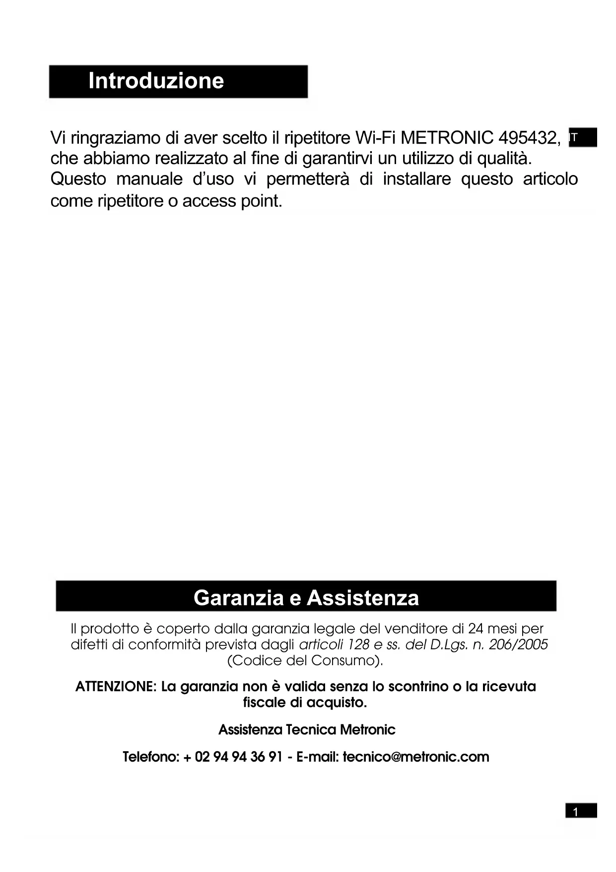 Introduzione Vi ringraziamo di aver scelto il ripetitore Wi-Fi METRONIC 495432, che abbiamo realizzato al ne di garantirvi un utilizzo di qualità. Questo manuale d’uso vi permetterà di installare questo articolo come ripetitore o access point. Garanzia e Assistenza Il prodotto è coperto dalla garanzia legale del venditore di 24 mesi per difetti di conformità prevista dagli articoli 128 e ss. del D.Lgs. n. 206/2005 (Codice del Consumo). ATTENZIONE: La garanzia non è valida senza lo scontrino o la ricevuta fiscale di acquisto. Assistenza Tecnica Metronic Telefono: + 02 94 94 36 91 - E-mail: tecnico@metronic.com2