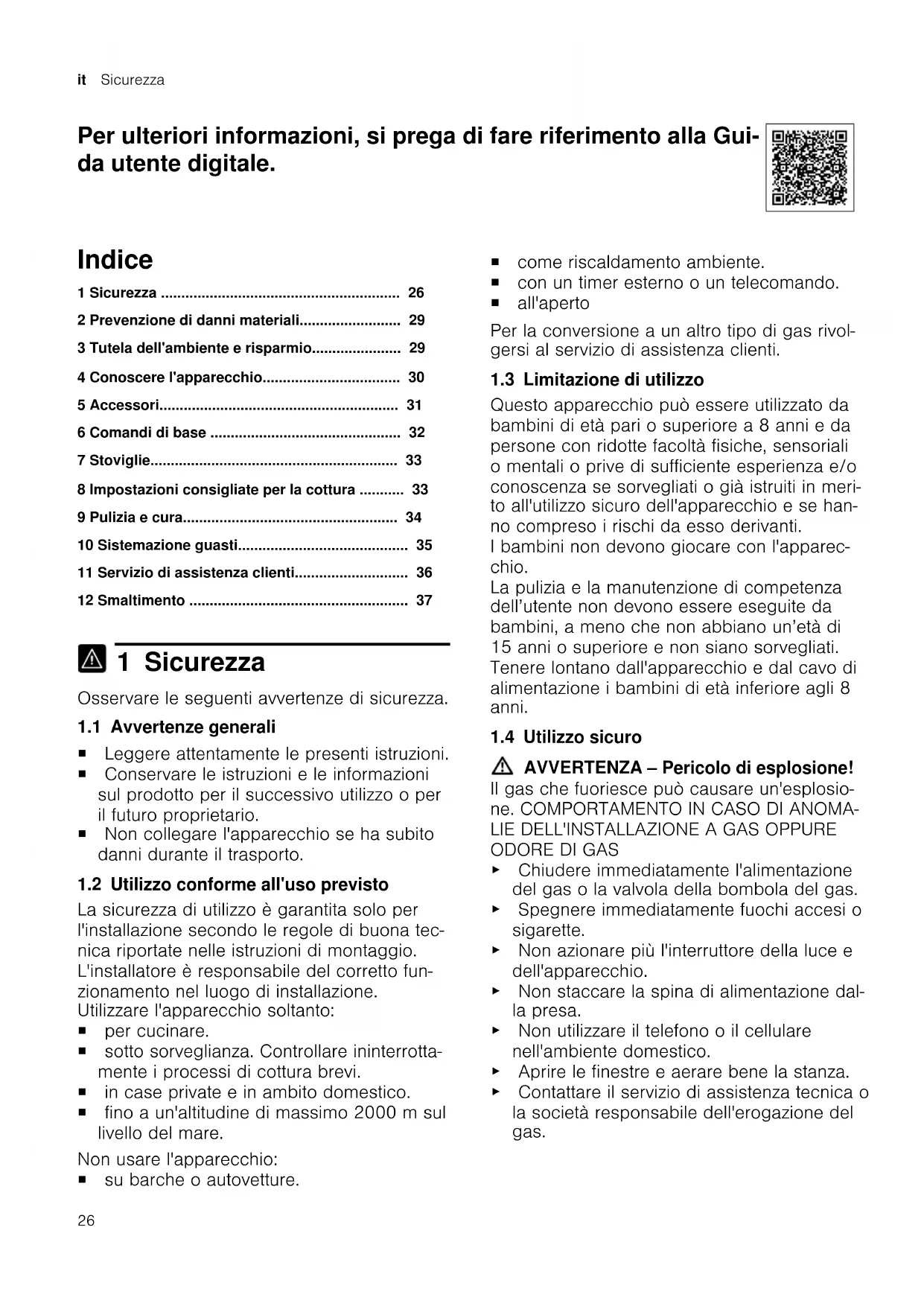 - 12 Smaltimento 1 Sicurezza Osservare le seguenti avvertenze di sicurezza. 1.1 Avvertenze generali ¡ Leggere attentamente le presenti istruzioni. ¡ Conservare le istruzioni e le informazioni sul prodotto per il successivo utilizzo o per il futuro proprietario. ¡ Non collegare l'apparecchio se ha subito danni durante il trasporto. 1.2 Utilizzo conforme all'uso previsto La sicurezza di utilizzo è garantita solo per l'installazione secondo le regole di buona tec- nica riportate nelle istruzioni di montaggio. L'installatore è responsabile del corretto fun- zionamento nel luogo di installazione. Utilizzare l'apparecchio soltanto: ¡ per cucinare. ¡ sotto sorveglianza. Controllare ininterrotta- mente i processi di cottura brevi. ¡ in case private e in ambito domestico. ¡ fino a un'altitudine di massimo 2000m sul livello del mare. Non usare l'apparecchio: ¡ su barche o autovetture. ¡ come riscaldamento ambiente. ¡ con un timer esterno o un telecomando. ¡ all'aperto Per la conversione a un altro tipo di gas rivol- gersi al servizio di assistenza clienti. 1.3 Limitazione di utilizzo Questo apparecchio può essere utilizzato da bambini di età pari o superiore a 8 anni e da persone con ridotte facoltà fisiche, sensoriali o mentali o prive di sufficiente esperienza e/o conoscenza se sorvegliati o già istruiti in meri- to all'utilizzo sicuro dell'apparecchio e se han- no compreso i rischi da esso derivanti. I bambini non devono giocare con l'apparec- chio. La pulizia e la manutenzione di competenza dell’utente non devono essere eseguite da bambini, a meno che non abbiano un’età di 15 anni o superiore e non siano sorvegliati. Tenere lontano dall'apparecchio e dal cavo di alimentazione i bambini di età inferiore agli 8 anni. 1.4 Utilizzo sicuro AVVERTENZA‒Pericolo di esplosione! Il gas che fuoriesce può causare un'esplosio- ne. COMPORTAMENTO IN CASO DI ANOMA- p. 37