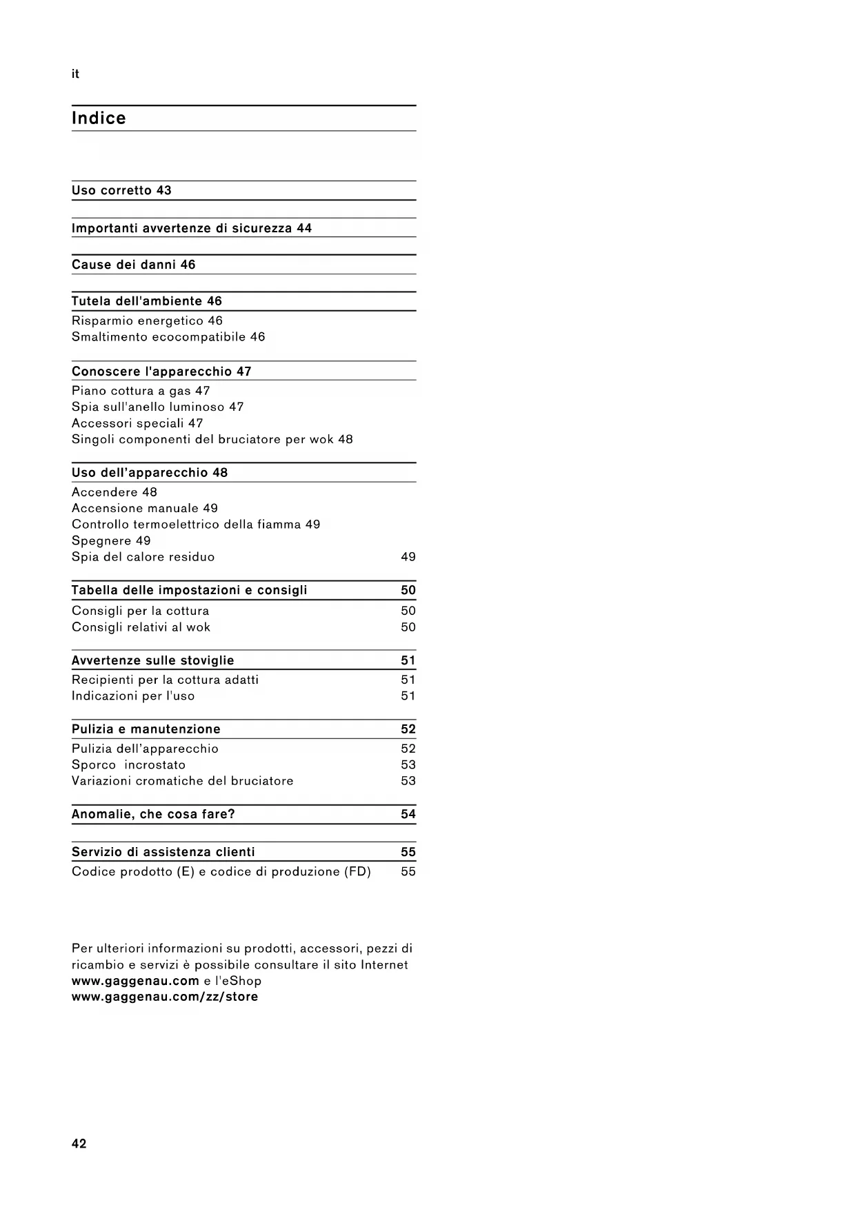 Indice Istruzioni per l’uso Uso corretto 43 Importanti avvertenze di sicurezza 44 Cause dei danni 46 Tutela dell'ambiente 46 Risparmio energetico 46 Smaltimento ecocompatibile 46 Conoscere l'apparecchio 47 Piano cottura a gas 47 Spia sull'anello luminoso 47 Accessori speciali 47 Singoli componenti del bruciatore per wok 48 Uso dell’apparecchio 48 Accendere 48 Accensione manuale 49 Controllo termoelettrico della fiamma 49 Spegnere 49 Spia del calore residuo 49 Tabella delle impostazioni e consigli 50 Consigli per la cottura 50 Consigli relativi al wok 50 Avvertenze sulle stoviglie 51 Recipienti per la cottura adatti 51 Indicazioni per l'uso 51 Pulizia e manutenzione 52 Pulizia dell’apparecchio 52 Sporco incrostato 53 Variazioni cromatiche del bruciatore 53 Anomalie, che cosa fare? 54 Servizio di assistenza clienti 55 Codice prodotto (E) e codice di produzione (FD) 55 Per ulteriori informazioni su prodotti, accessori, pezzi di ricambio e servizi è possibile consultare il sito Internet www.gaggenau.com e l'eShop www.gaggenau.com/zz/store43 Uso corretto
