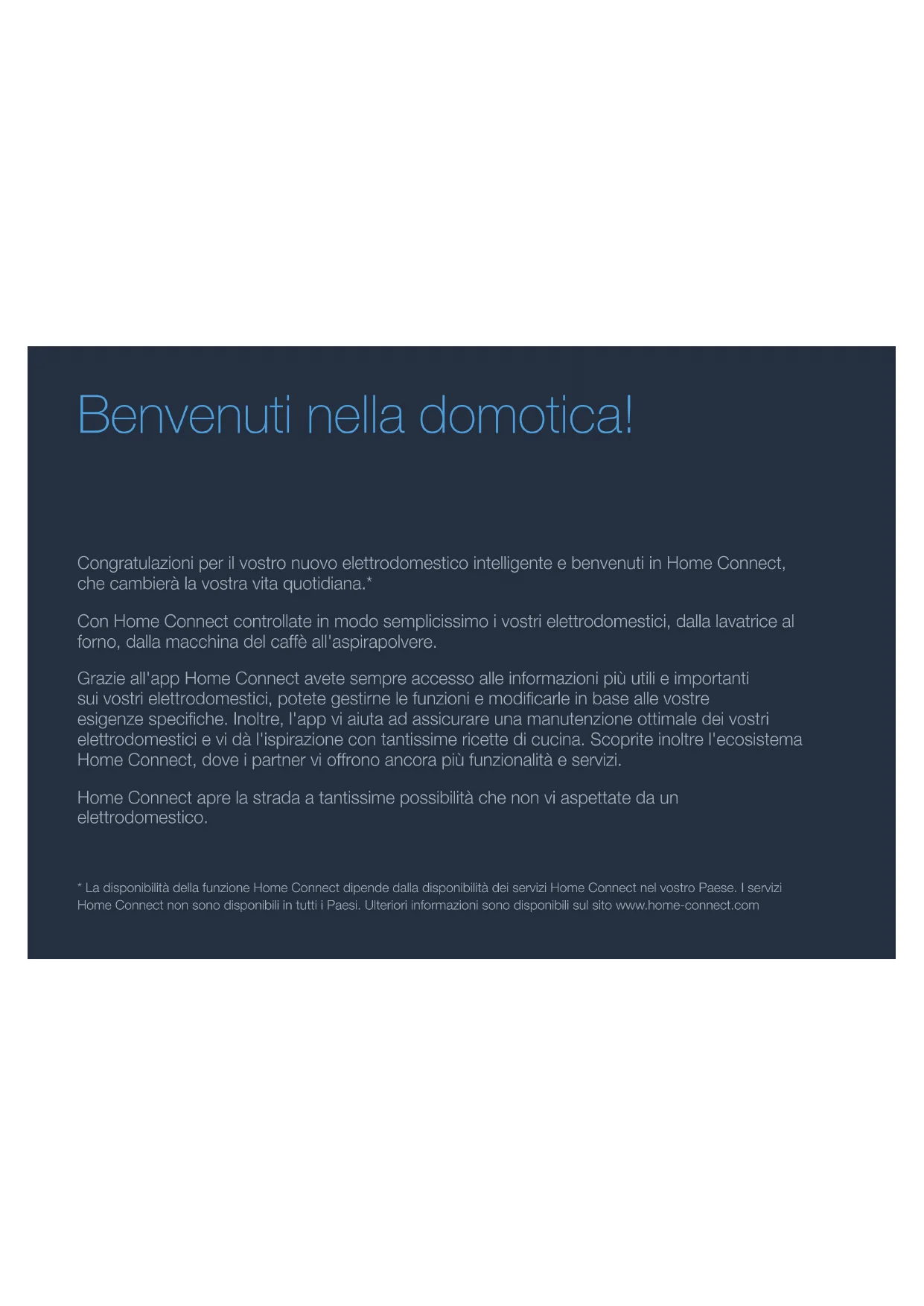 319 FR Étape 3 : connecter le réfrigérateur à l’appliHomeConnect Suivez les instructions gurant à l’étape 3 uniquement lorsque l’appli vous y invite. Les étapes suivantes décrivent la commande au niveau de l’appareil électroménager. 1 | Ouvrez le menu Réseau domestique sur le réfrigérateur. 2 | Avec la touche ,faitesdélerjusqu’aupointdemenu Connecter à l’appli . 3 | Appuyezsurlatouche pourouvrirlepointdemenu. Connecter à l’appli 4 | Lebandeaudecommandedevotreréfrigérateurindique Connecter à l’appareil mobile. 5 | Appuyezsurlatouche pourconrmer. L’applitentedeseconnecterauréfrigérateur.Lebandeaude commandedevotreréfrigérateurindiqueSynchronisation en cours. Synchronisation en cours 6 | Suivezlesinstructionsdel’applipouracheverlaprocédure. Silaconnexionaréussi,Connexion à l’appli réussieapparaîtsurlebandeaudecommandedevotre réfrigérateur. Connexion à l’appli réussie 7 | Conrmezavec . Labarred’étatdubandeaudecommandefaitapparaître . 8 | Veuillezsuivrelesinstructionsdel’appli. Remarque: Silaconnexionnepeutêtreétablieavecsuccès, assurez-vousquevotresmartphone/tabletteest bienàportéedevotreréseaudomestique. 320 DE CongratulazioniperilvostronuovoelettrodomesticointelligenteebenvenutiinHomeConnect, checambieràlavostravitaquotidiana.* ConHomeConnectcontrollateinmodosemplicissimoivostrielettrodomestici,dallalavatriceal forno,dallamacchinadelcaffèall'aspirapolvere. Grazieall'appHomeConnectavetesempreaccessoalleinformazionipiùutilieimportanti suivostrielettrodomestici,potetegestirnelefunzioniemodicarleinbaseallevostre esigenzespeciche.Inoltre,l'appviaiutaadassicurareunamanutenzioneottimaledeivostri elettrodomesticievidàl'ispirazionecontantissimericettedicucina.Scopriteinoltrel'ecosistema HomeConnect,doveipartnervioffronoancorapiùfunzionalitàeservizi. HomeConnectaprelastradaatantissimepossibilitàchenonviaspettatedaun elettrodomestico. *LadisponibilitàdellafunzioneHomeConnectdipendedalladisponibilitàdeiserviziHomeConnectnelvostroPaese.Iservizi HomeConnectnonsonodisponibiliintuttiiPaesi.Ulterioriinformazionisonodisponibilisulsitowww.home-connect.com Benvenuti nella domotica!21 IT Scopritelepossibilitàofferteda HomeConnect Gestite i vostri elettrodomestici Nellapanoramicatrovatetuttiglielettrodomesticicollegati eaveteaccessoainformazioniimportantieutili.Potetead esempiogestirnelefunzioniemodicarleinbaseallevostre esigenzespeciche. Lasciatevi ispirare Lasezionedellericetteoffresvariatericette,consiglievideo cherenderannoancorapiùbellocucinare. Aiuto e supporto Lasezionediassistenzaoffreinformazioniutilisul corretto uso e sulla corretta manutenzione del vostro elettrodomestico. Ancora più vantaggi Lanostraretedipartnerèincostantecrescita.Trovateun elencodituttiipartnerall'indirizzo www.home-connect.com. Iniziamo subito! Eccocosaviserve: 1 | Frigorifero collegato alla corrente e acceso. 2 | UnosmartphoneotabletconsistemaoperativoiOSo Androidaggiornatoall'ultimaversione. 3 | FrigoriferonelraggiodalsegnaleWi-Fidellavostrarete domestica. 4 | Ilnome(SSID)elapassword(Key)dellavostrareteWi-Fi. 5 | Questeistruzioniperl'installazione. Informazioneimportante: Sicurezza dei dati:lasicurezzadeidatirappresenta lamassimaprioritàperHomeConnect.Lo scambiodidatiavvienesempreinmodocriptato. HomeConnectadottamisuredisicurezzache vengonovericateeaggiornateaintervalliregolari. Permaggioriinformazioni: www.home-connect.com. Sicurezza dell'apparecchio:perutilizzare in modo sicuro il vostro elettrodomestico con HomeConnect,attenetevialleavvertenzedi sicurezzacontenutenellecorrispondentiistruzioni perl'uso.22 IT Fase 2: collegamento del frigorifero alla rete domestica 1 | Ilfrigoriferoègiàcollegatoallacorrenteedèacceso. 2 | Apritel'appHomeConnectperaggiungereilvostrofrigorifero. 3 | Seguiteleistruzioninell'appefateriferimentoaqueste istruzionisoltantoserichiestodall'app Nota: Lavoriamocostantementepermigliorarel'app HomeConnect.Perquestomotivo,vipotrebbero esserediscrepanzetralefasidaeseguireperil collegamento. Attenetevi alle istruzioni della versione piùrecentedellavostraappHomeConnect,chevi guideràattraversoilprocessodicollegamento. Fase 1:downloaddell'app HomeConnectecreazionediunaccount utente 1 | Apritel'AppStore(dispositiviApple)oGooglePlayStore (dispositiviAndroid)dalvostrosmartphoneotablet. 2 | Cercate"HomeConnect"nellostoreeinstallate l'app. AppHomeConnect: 3 | Apritel'apperegistratevipercreareunaccountutente HomeConnect. 4 | PrendetenotadeidatidiaccessoaHomeConnect(account utenteepassword):neavretebisognoinunsecondo momento. L'appviguidaattraversolefasinecessariepercollegareil vostroelettrodomesticoaHomeConnect.L'apprimandaa questeistruzionisenecessario.23 IT Passaggio 2.1: collegamento del frigoriferoallaretedomesticaconWPS Seguite le istruzioni della fase 2.1 soltanto se l'app lo richiede. Le fasi seguenti descrivono le operazioni sull'elettrodomestico. 1 | PremeteiltastoSperaprireilmenuprincipale. 2 | Con il tasto sfogliatenoallavocedimenuImpostazioni di base . 3 | Peraprirelavocedimenupremeteiltasto