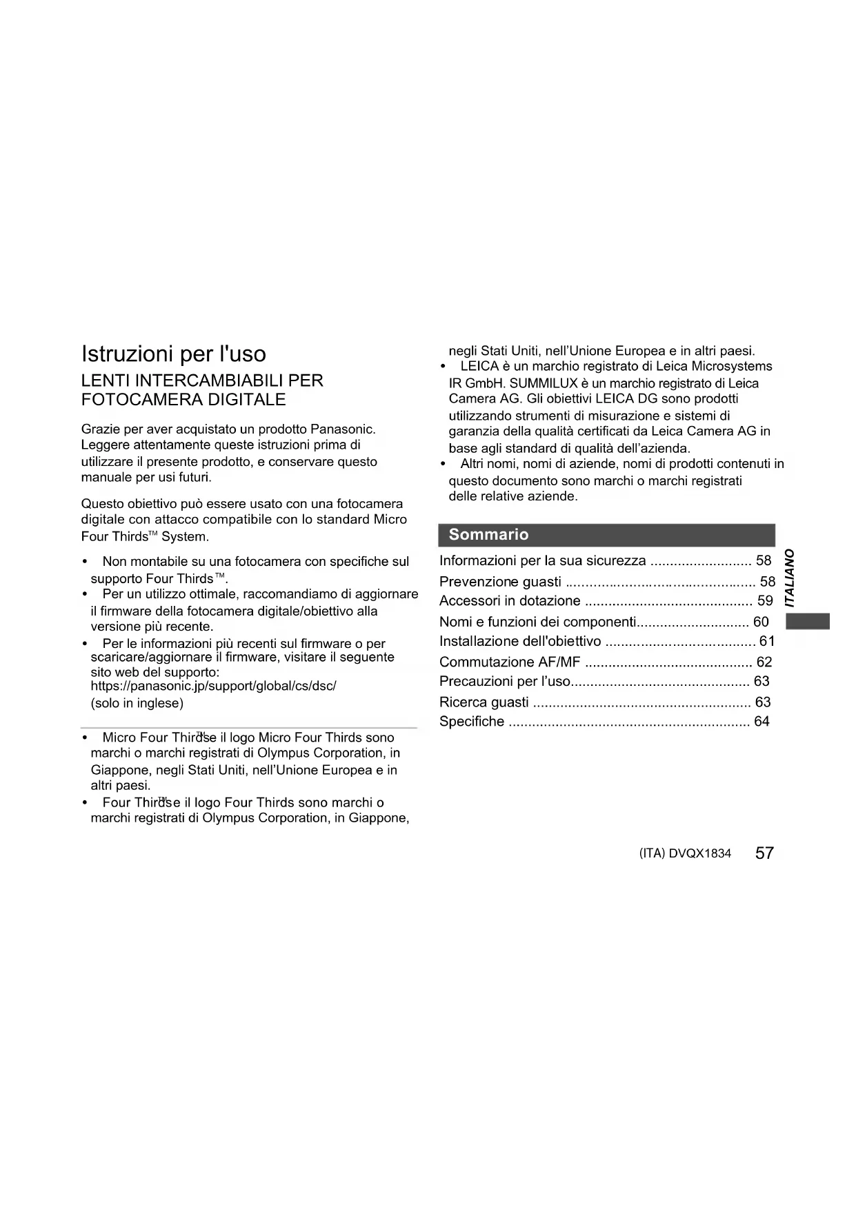 - e il logo Four Thirds sono marchi o marchi registrati di Olympus Corporation, in Giappone, negli Stati Uniti, nell’Unione Europea e in altri paesi. 0 LEICA è un marchio registrato di Leica Microsystems IR GmbH. SUMMILUX è un marchio registrato di Leica Camera AG. Gli obiettivi LEICA DG sono prodotti utilizzando strumenti di misurazione e sistemi di garanzia della qualità certificati da Leica Camera AG in base agli standard di qualità dell’azienda. 0 Altri nomi, nomi di aziende, nomi di prodotti contenuti in questo documento sono marchi o marchi registrati delle relative aziende. Informazioni per la sua sicurezza p. 58