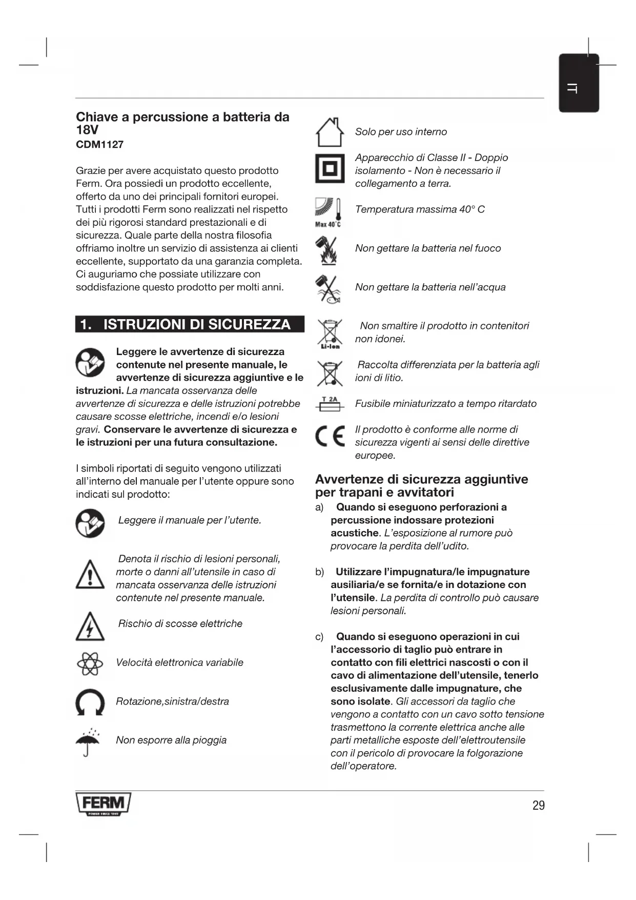 Chiave a percussione a batteria da 18V CDM1127 Grazie per avere acquistato questo prodotto Ferm. Ora possiedi un prodotto eccellente, offerto da uno dei principali fornitori europei. Tutti i prodotti Ferm sono realizzati nel rispetto dei più rigorosi standard prestazionali e di sicurezza. Quale parte della nostra filosofia offriamo inoltre un servizio di assistenza ai clienti eccellente, supportato da una garanzia completa. Ci auguriamo che possiate utilizzare con soddisfazione questo prodotto per molti anni.