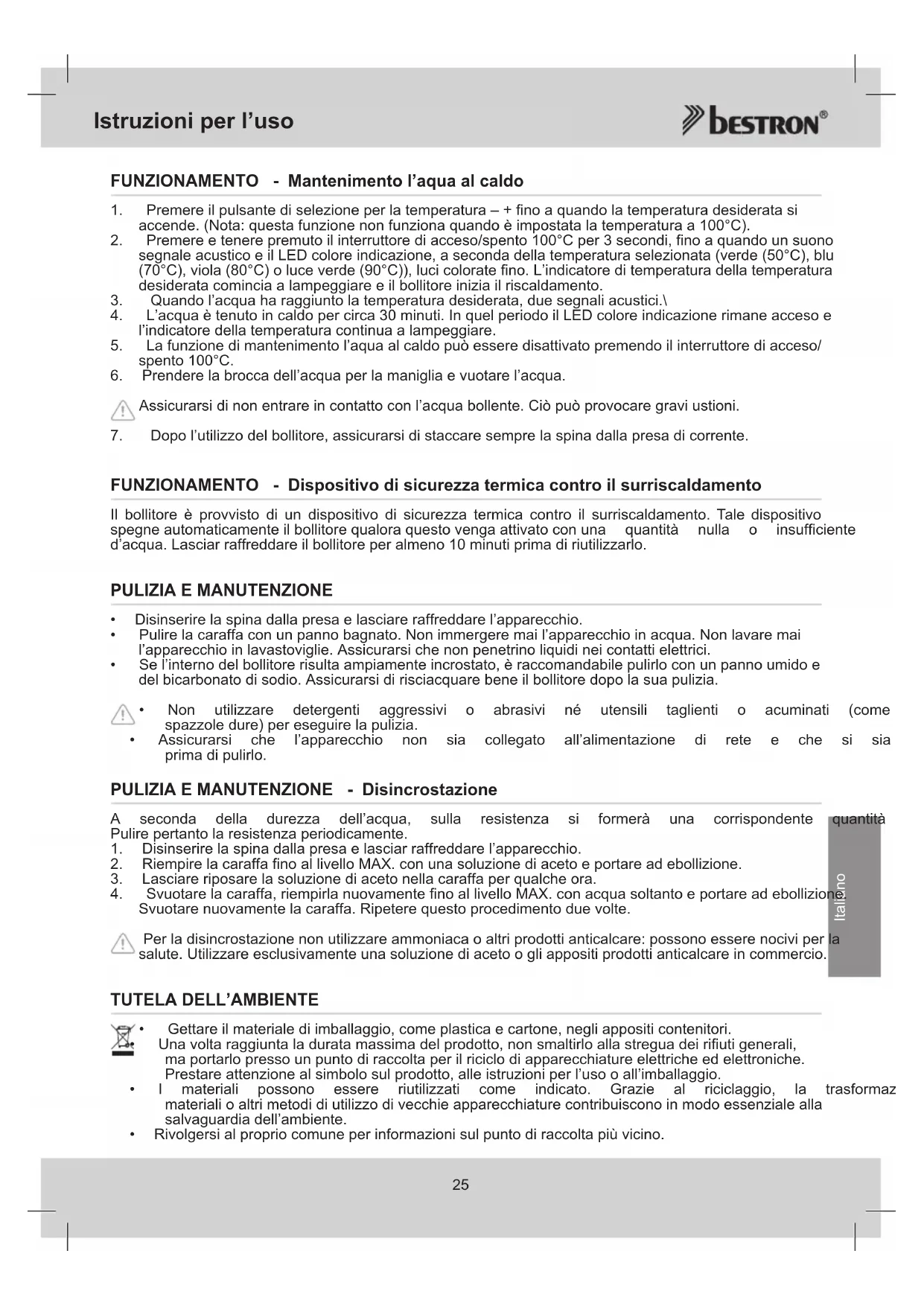 Scarica le istruzioni per il tuo Bollitore in formato PDF gratuitamente! Trova il tuo manuale AWK683 - BESTRON e riprendi in mano il tuo dispositivo elettronico. In questa pagina sono pubblicati tutti i documenti necessari per l'utilizzo del tuo dispositivo. AWK683 del marchio BESTRON.