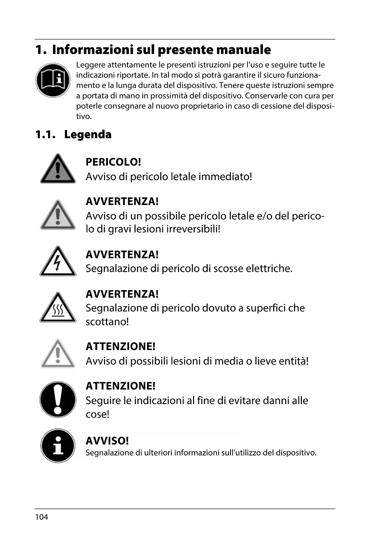 Leggere attentamente le presenti istruzioni per l’uso e seguire tutte le indicazioni riportate. In tal modo si potrà garantire il sicuro funziona- mento e la lunga durata del dispositivo. Tenere queste istruzioni sempre a portata di mano in prossimità del dispositivo. Conservarle con cura per poterle consegnare al nuovo proprietario in caso di cessione del disposi- tivo. 1.1. Legenda PERICOLO! Avviso di pericolo letale immediato! AVVERTENZA! Avviso di un possibile pericolo letale e/o del perico- lo di gravi lesioni irreversibili! AVVERTENZA! Segnalazione di pericolo di scosse elettriche. AVVERTENZA! Segnalazione di pericolo dovuto a superfici che scottano! ATTENZIONE! Avviso di possibili lesioni di media o lieve entità! ATTENZIONE! Seguire le indicazioni al fine di evitare danni alle cose! AVVISO! Segnalazione di ulteriori informazioni sull'utilizzo del dispositivo.DE