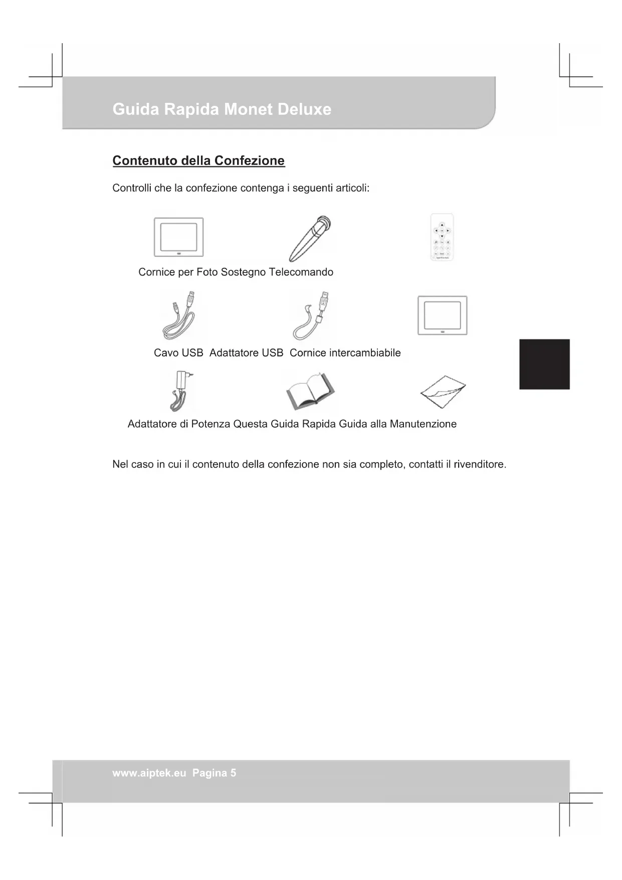 MPEG4 prolo semplice (codec MP4) 720x480,30fps, o 720x576,25fps 2.4M AAC 48K 128KGuida Rapida Monet Deluxe ENDEFRITTU www.aiptek.eu Pagina 16 Guida Rapida Monet Deluxe Gestione File Nella sezione Gestione File, lei potrà vedere, cancellare o copiare tutti i suoi dati nella memoria interna. Utilizzi i tasti sopra/sotto per navigare nell’elenco dei le (cartelle). Le immagini sono visualizzate nella nestra di anteprima a destra. Finestra di anteprima Elenco le Sono disponibili le seguenti opzioni Pulsante Telecomando Funzione sinistra sinistra Apri la nestra per la cancellazione del le selezionato. destra destra Apri il menu per copiare un le nella memoria interna (disponibile solo quando è stata selezionata una memoria esterna come media) ESC ESC Esci da Gestione File / CartellaGuida Rapida Monet Deluxe ENDEFRITTU www.aiptek.eu Pagina 17 Impostazioni Nel menu impostazioni, potrà congurare la cornice e regolarla secondo le sue preferenze. Usi i tasti sopra/sotto per navigare attraverso le opzioni principali a sinistra e usi il tasto ENTER (OK) per selezionare un’opzione dal menù. Le opzioni di impostazione vengono visualizzate a destra. L’opzione attualmente selezionata è contrassegnata da un segno di spunta giallo. Per cambiare la selezione, scorra la lista no alla voce desiderata e confermi con ENTER (OK). Possibili valori per le opzioni principali Opzioni principali Si possono regolare le seguenti opzioni: Opzione principale Descrizione Lingua Seleziona la lingua dei testi del menù della cornice Durata Presentazione Seleziona per quanto tempo un’immagine viene visualizzata in modalità presentazione Effetti presentazione Seleziona gli effetti di transizione che devono essere visualizzati tra le immagini Impostazioni Video Utilizzi le frecce sinistra/destra per regolare la dimensione del video ed il tipo di riproduzione. Utilizzi ESC per ritornare alle opzioni principali Imposta avvio Seleziona in quale modalità la cornice deve avviarsi Regola Orario Regola l’orario e la data della cornice. Utilizzi le frecce sinistra/destra per diminuire/aumentare i valori. Utilizzi ESC per ritornare alle opzioni principaliGuida Rapida Monet Deluxe ENDEFRITTU www.aiptek.eu Pagina 18 Guida Rapida Monet Deluxe Opzione principale Descrizione Sveglia Utilizzi le frecce sinistra/destra per regolare l’orario della sveglia, l’intervallo, il segnale della sveglia e lo snooze, e utilizzi ESC per ritornare alle opzioni principali Ambiente Sistema Utilizzi le frecce sinistra/destra per regolare la luminosità, il contrasto e la saturazione, e utilizzi ESC per ritornare alle opzioni principali. Inoltre può utilizzare ENTER (OK) per controllare la versione o resettare il dispositivo ai suoi parametri di default di fabbrica Connessione PC Per copiare dati nella memoria interna, può collegare Monet Deluxe attraverso la connessione USB direttamente con il PC. Colleghi la cornice all’adattatore di potenza come descritto in precedenza, e la accenda. Quindi, utilizzi il cavo USB in dotazione e lo colleghi alla cornice e al suo PC. A questo punto tutti i driver di sistema necessari saranno installati e dopo alcuni secondi, apparirà una nestra popup che vi informerà che la cornice può essere usata per immagazzinare i dati. Copi, come fa con Windows, i le nella cornice.Guida Rapida Monet Deluxe ENDEFRITTU www.aiptek.eu Pagina 19 Speciche Display LCD Display LCD 8” TFT LCD Retroilluminazione LED Risoluzione 800 x 600 RGB Area di visualizzazione 162mm × 121.5mm (W x H) Aspect ratio 4:3 Luminosità 250 cd/m