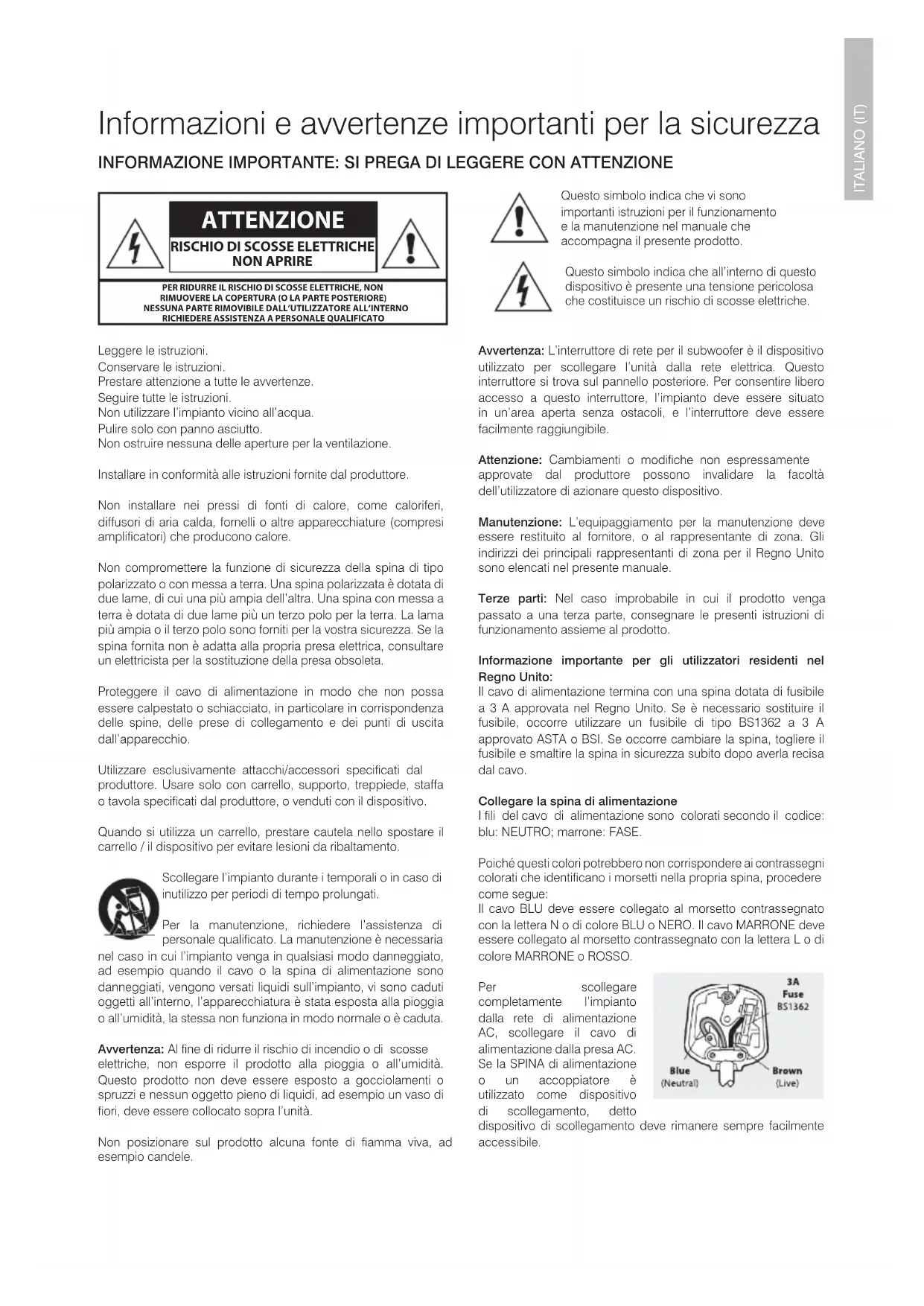 NON APRIRE ATTENZIONE PER RIDURRE IL RISCHIO DI SCOSSE ELETTRICHE, NON RIMUOVERE LA COPERTURA (O LA PARTE POSTERIORE)NESSUNA PARTE RIMOVIBILE DALL’UTILIZZATORE ALL’INTERNORICHIEDERE ASSISTENZA A PERSONALE QUALIFICATO Leggere le istruzioni. Conservare le istruzioni. Prestare attenzione a tutte le avvertenze. Seguire tutte le istruzioni. Non utilizzare l’impianto vicino all’acqua. Pulire solo con panno asciutto. Non ostruire nessuna delle aperture per la ventilazione. Installare in conformità alle istruzioni fornite dal produttore. Non installare nei pressi di fonti di calore, come caloriferi, diffusori di aria calda, fornelli o altre apparecchiature (compresi amplicatori) che producono calore. Non compromettere la funzione di sicurezza della spina di tipo polarizzato o con messa a terra. Una spina polarizzata è dotata di due lame, di cui una più ampia dell’altra. Una spina con messa a terra è dotata di due lame più un terzo polo per la terra. La lama più ampia o il terzo polo sono forniti per la vostra sicurezza. Se la spina fornita non è adatta alla propria presa elettrica, consultare un elettricista per la sostituzione della presa obsoleta. Proteggere il cavo di alimentazione in modo che non possa essere calpestato o schiacciato, in particolare in corrispondenza delle spine, delle prese di collegamento e dei punti di uscita dall’apparecchio. Utilizzare esclusivamente attacchi/accessori specicati dal produttore. Usare solo con carrello, supporto, treppiede, staffa o tavola specicati dal produttore, o venduti con il dispositivo. Quando si utilizza un carrello, prestare cautela nello spostare il carrello / il dispositivo per evitare lesioni da ribaltamento. Scollegare l’impianto durante i temporali o in caso di inutilizzo per periodi di tempo prolungati. Per la manutenzione, richiedere l’assistenza di personale qualicato. La manutenzione è necessaria nel caso in cui l’impianto venga in qualsiasi modo danneggiato, ad esempio quando il cavo o la spina di alimentazione sono danneggiati, vengono versati liquidi sull’impianto, vi sono caduti oggetti all’interno, l’apparecchiatura è stata esposta alla pioggia o all’umidità, la stessa non funziona in modo normale o è caduta. Avvertenza: Al ne di ridurre il rischio di incendio o di scosse elettriche, non esporre il prodotto alla pioggia o all’umidità. Questo prodotto non deve essere esposto a gocciolamenti o spruzzi e nessun oggetto pieno di liquidi, ad esempio un vaso di ori, deve essere collocato sopra l’unità. Non posizionare sul prodotto alcuna fonte di amma viva, ad esempio candele. Avvertenza: L’interruttore di rete per il subwoofer è il dispositivo utilizzato per scollegare l’unità dalla rete elettrica. Questo interruttore si trova sul pannello posteriore. Per consentire libero accesso a questo interruttore, l’impianto deve essere situato in un’area aperta senza ostacoli, e l’interruttore deve essere facilmente raggiungibile. Attenzione: Cambiamenti o modiche non espressamente approvate dal produttore possono invalidare la facoltà dell’utilizzatore di azionare questo dispositivo. Manutenzione: L’equipaggiamento per la manutenzione deve essere restituito al fornitore, o al rappresentante di zona. Gli indirizzi dei principali rappresentanti di zona per il Regno Unito sono elencati nel presente manuale. Terze parti: Nel caso improbabile in cui il prodotto venga passato a una terza parte, consegnare le presenti istruzioni di funzionamento assieme al prodotto. Informazione importante per gli utilizzatori residenti nel Regno Unito: Il cavo di alimentazione termina con una spina dotata di fusibile a 3 A approvata nel Regno Unito. Se è necessario sostituire il fusibile, occorre utilizzare un fusibile di tipo BS1362 a 3 A approvato ASTA o BSI. Se occorre cambiare la spina, togliere il fusibile e smaltire la spina in sicurezza subito dopo averla recisa dal cavo. Collegare la spina di alimentazione I li del cavo di alimentazione sono colorati secondo il codice: blu: NEUTRO; marrone: FASE. Poiché questi colori potrebbero non corrispondere ai contrassegni colorati che identicano i morsetti nella propria spina, procedere come segue: Il cavo BLU deve essere collegato al morsetto contrassegnato con la lettera N o di colore BLU o NERO. Il cavo MARRONE deve essere collegato al morsetto contrassegnato con la lettera L o di colore MARRONE o ROSSO. Per scollegare completamente l’impianto dalla rete di alimentazione AC, scollegare il cavo di alimentazione dalla presa AC. Se la SPINA di alimentazione o un accoppiatore è utilizzato come dispositivo di scollegamento, detto dispositivo di scollegamento deve rimanere sempre facilmente accessibile.72 73 Introduzione Grazie per aver acquistato un prodotto Q Acoustics. Il presente manuale ha lo scopo di guidare l’utilizzatore nell’installazione e congurazione dell’unità e di aiutarlo ad ottenere dal prodotto le prestazioni ottimali. Si prega di leggere con attenzione le istruzioni, le informazioni e avvertenze importanti per la sicurezza prima di installare e utilizzare il prodotto, in modo da garantirne il funzionamento soddisfacente e in sicurezza. Controllare il prodotto attentamente. Se un articolo risulta danneggiato o mancante, riferirlo al proprio rivenditore il prima possibile. Ci auguriamo che godiate al massimo dell’esperienza Q Acoustics. ITALIANO (IT)72 73 Inlare i dadi di bloccaggio sulle punte coniche e avvitare tutte e quattro le punte coniche sui piedi del subwoofer. Se il pavimento è in legno o in pietra mettere un disco di protezione sopra ciascuna punta conica prima di rimettere l’altoparlante in posizione verticale. Quando l’altoparlante è posizionato correttamente regolare tutte le punte coniche no a quando l’altoparlante è a livello e stabile. ITALIANO (IT) Preparazione Sollevare gli altoparlanti dai cartoni afferrandone le casse. Non toccare i driver né usare le buste protettive per slarli. Gli altoparlanti Q B12 s
