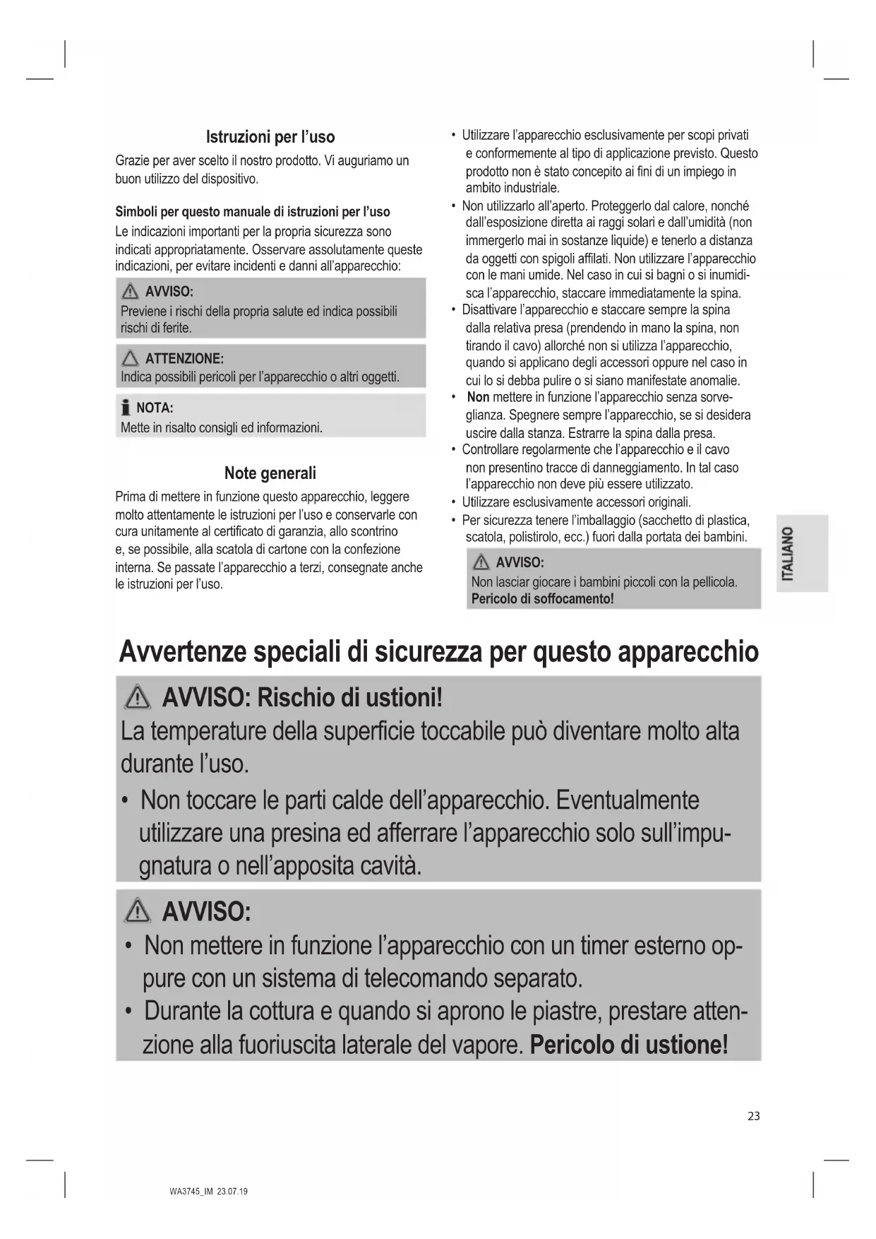 - Durante la cottura e quando si aprono le piastre, prestare atten- zione alla fuoriuscita laterale del vapore. Pericolo di ustione!WA3745_IM 23.07.19