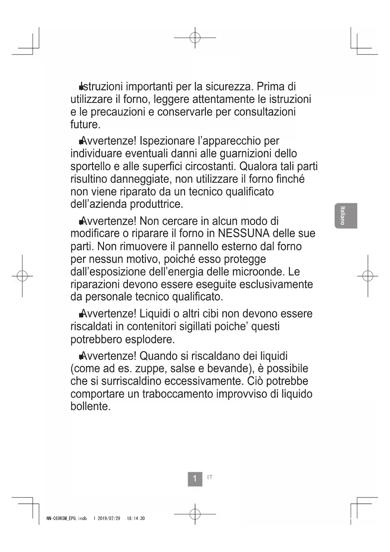 Avvertenze! Quando si riscaldano dei liquidi (come ad es. zuppe, salse e bevande), è possibile che si surriscaldino eccessivamente. Ciò potrebbe comportare un traboccamento improvviso di liquido bollente. NN-C69KSM_EPG.indb 1 2019/07/29 18:14:302