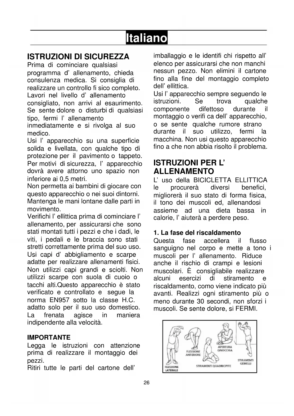 Prima di cominciare qualsiasi programma d’ allenamento, chieda consulenza medica. Si consiglia di realizzare un controllo fi sico completo. Lavori nel livello d’ allenamento consigliato, non arrivi al esaurimento. Se sente dolore o disturbi di qualsiasi tipo, fermi l’ allenamento inmediatamente e si rivolga al suo medico. Usi l’ apparecchio su una superficie solida e livellata, con qualche tipo di protezione per il pavimento o tappeto. Per motivi di sicurezza, l’ apparecchio dovrà avere attorno uno spazio non inferiore ai 0,5 metri. Non permetta ai bambini di giocare con questo apparecchio o nei suoi dintorni. Mantenga le mani lontane dalle parti in movimento. Verifichi l’ ellittica prima di cominciare l’ allenamento, per assicurarsi che sono stati montati tutti i pezzi e che i dadi, le viti, i pedali e le braccia sono stati stretti correttamente prima del suo uso. Usi capi d’ abbigliamento e scarpe adatte per realizzare allenamenti fisici. Non utilizzi capi grandi e sciolti. Non utilizzi scarpe con suola di cuoio o tacchi alti.Questo apparecchio è stato verificato e controllato e segue la norma EN957 sotto la classe H.C. adatto solo per il suo uso domestico. La frenata agisce in maniera indipendente alla velocità. IMPORTANTE Legga le istruzioni con attenzione prima di realizzare il montaggio dei pezzi. Ritiri tutte le parti del cartone dell’ imballaggio e le identifi chi rispetto all’ elenco per assicurarsi che non manchi nessun pezzo. Non elimini il cartone fino alla fine del montaggio completo dell’ ellittica. Usi l’ apparecchio sempre seguendo le istruzioni. Se trova qualche componente difettoso durante il montaggio o verifi ca dell’ apparecchio, o se sente qualche rumore strano durante il suo utilizzo, fermi la macchina. Non usi questo apparecchio fino a che non abbia risolto il problema.