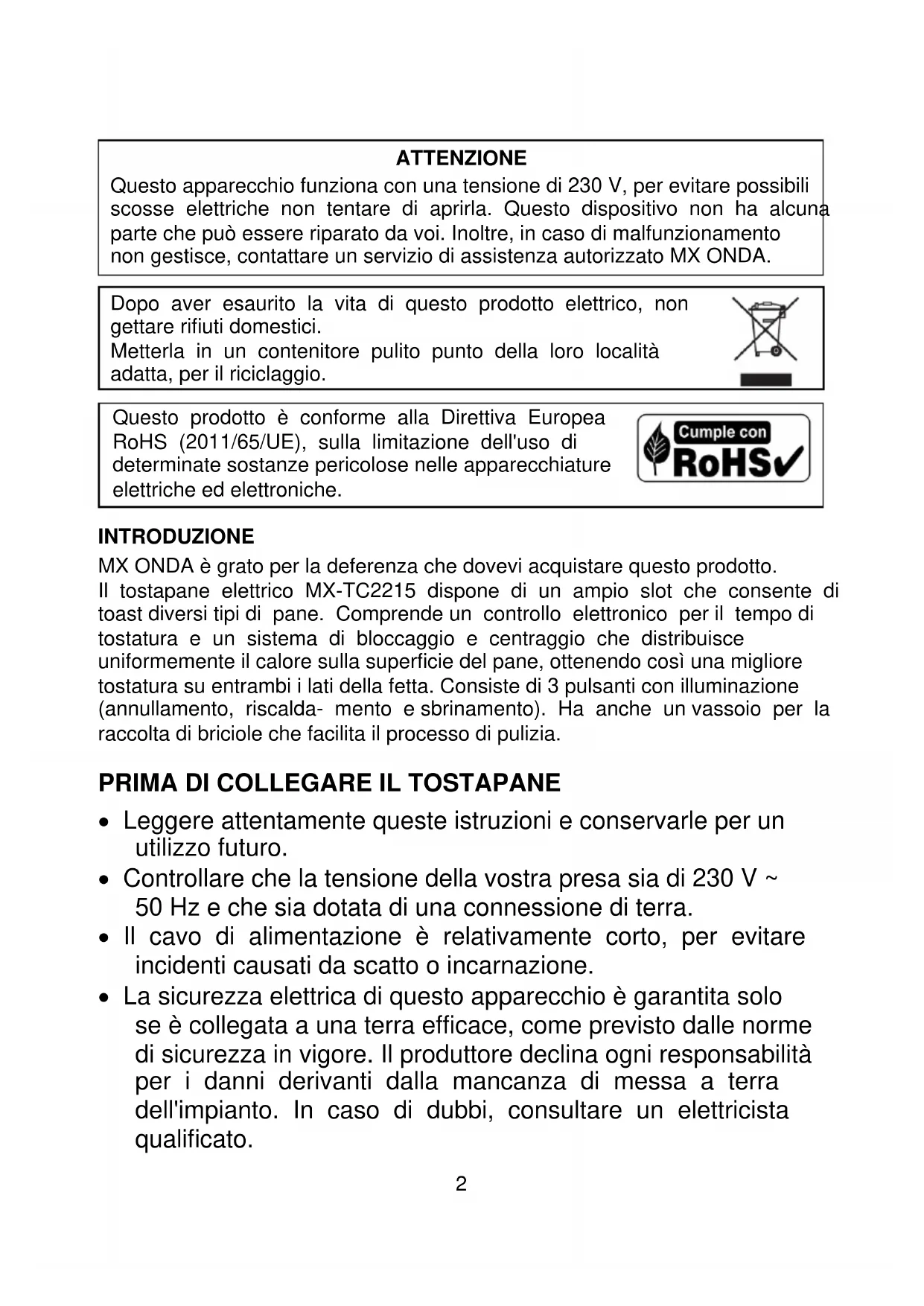 Questo prodotto è conforme alla Direttiva Europea RoHS (2011/65/UE), sulla limitazione dell'uso di determinate sostanze pericolose nelle apparecchiature elettriche ed elettroniche. INTRODUZIONE MX ONDA è grato per la deferenza che dovevi acquistare questo prodotto. Il tostapane elettrico MX-TC2215 dispone di un ampio slot che consente di toast diversi tipi di pane. Comprende un controllo elettronico per il tempo di tostatura e un sistema di bloccaggio e centraggio che distribuisce uniformemente il calore sulla superficie del pane, ottenendo così una migliore tostatura su entrambi i lati della fetta. Consiste di 3 pulsanti con illuminazione (annullamento, riscalda- mento e sbrinamento). Ha anche un vassoio per la raccolta di briciole che facilita il processo di pulizia.