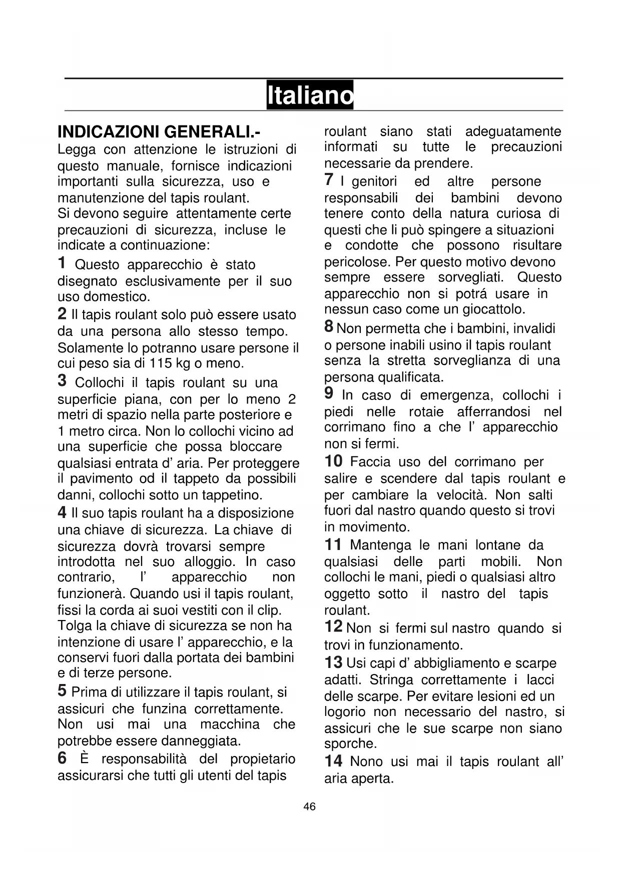 Italiano INDICAZIONI GENERALI.- Legga con attenzione le istruzioni di questo manuale, fornisce indicazioni importanti sulla sicurezza, uso e manutenzione del tapis roulant. Si devono seguire attentamente certe precauzioni di sicurezza, incluse le indicate a continuazione: