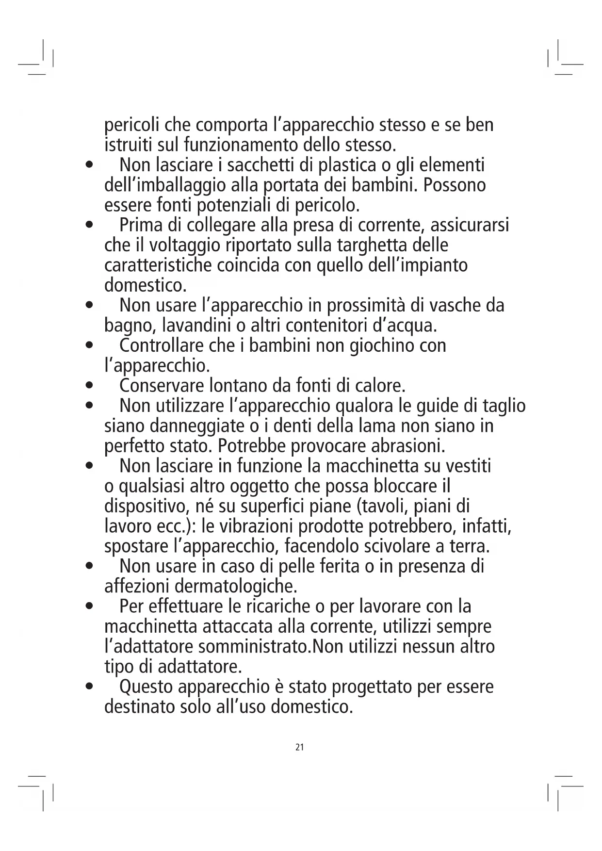 - Per effettuare le ricariche o per lavorare con la macchinetta attaccata alla corrente, utilizzi sempre l’adattatore somministrato.Non utilizzi nessun altro tipo di adattatore.