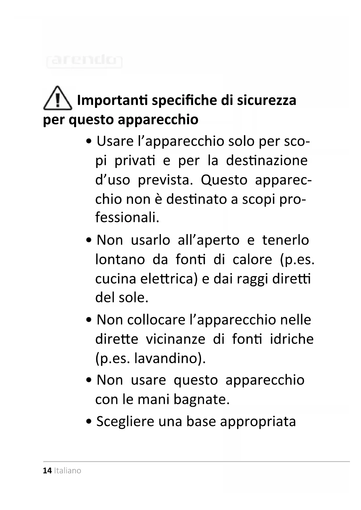 - I bambini possono usare o pulire il disposivo unicamente soo la sorveglianza e la guida di un adulto.19Italiano Grazie per aver acquistato un prodoo Arendo. Leggere aentamente la seguente Guida rapida in modo da poter ulizzare a lungo l’apparecchio acquistato. Prima di meere in servizio il prodoo consegnato, la preghiamo di vericare che esso sia completo, privo di dife e non danneggiato.