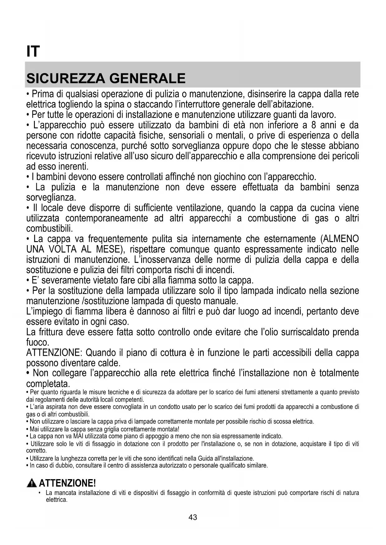 - Non utilizzare o lasciare la cappa priva di lampade correttamente montate per possibile rischio di scossa elettrica.