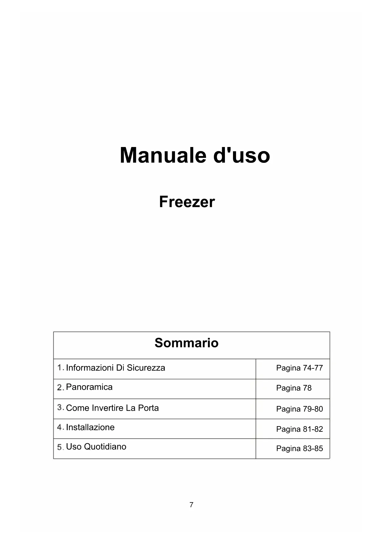 ela mento Per permettervi di ottenere i migliori risultati dal processo di congelamento, riportiamo qui di seguito alcuni consigli importanti: ವ la q uantità massima di alimenti che può essere congelata nell’arco di 24 ore è indicata sulla targa dei dati tecnici; il processo di congelamento richiede 24 ore. Durante questo periodo non è possibile aggiungere altri alimenti da congelare: ವ congelare solo alimenti di qualità, freschi e ripuliti con cura; ವ preparare gli alimenti in piccole porzioni per congelarli rapidamente e completamente e per potere scongelare successivamente solo la quantità richiesta; ವ avvolgere gli alimenti in pellicole di alluminio o polietilene ed assicurarsi che le confezioni siano a tenuta; ವ non mettere a contatto alimenti freschi, non congelati con altri congelati, per evitare un aumento della temperatura di questi ultimi; ವ gli alimenti magri si conservano meglio e più a lungo di quelli grassi; il sale riduce la durata di conservazione degli alimenti; 83Uso quotidiano i cubetti di ghiaccio, se consumati immediatamente dopo la rimozione dal vano del freezer, rischiano di provocare lesioni da freddo sulla pelle; si consiglia di riportare la data di congelamento su ogni singola confezione per poterla estrarre dal vano freezer; tenere sempre presente che gli alimenti congelati rischiano di provocare lesioni da freddo; si consiglia di riportare la data di congelamento su ogni singola confezione, per tenerne traccia ai fini di una corretta conservazione. Suggerimenti per la conservazione di alimenti congelati Per ottenere le migliori prestazioni da questo elettrodomestico, si consiglia di: accertarsi che gli alimenti congelati commercialmente siano stati conservati correttamente dal rivenditore; ವ accertarsi che gli alimenti congelati vengano trasferiti dal rivenditore degli alimenti al freezer il più rapidamente possibile; non aprire frequentemente la porta e non lasciarla aperta più a lungo di quanto assolutamente necessario. Una volta scongelati, gli alimenti si deteriorano rapidamente e non possono essere ricongelati. Non superare il periodo di conservazione indicato dal produttore degli alimenti. Pulizia Per motivi igienici, si consiglia di pulire con regolarità la parte interna dell'elettrodomestico, ivi compresi gli accessori interni. Avvertenza! L'elettrodomestico non deve essere collegato all'alimentazione di rete durante