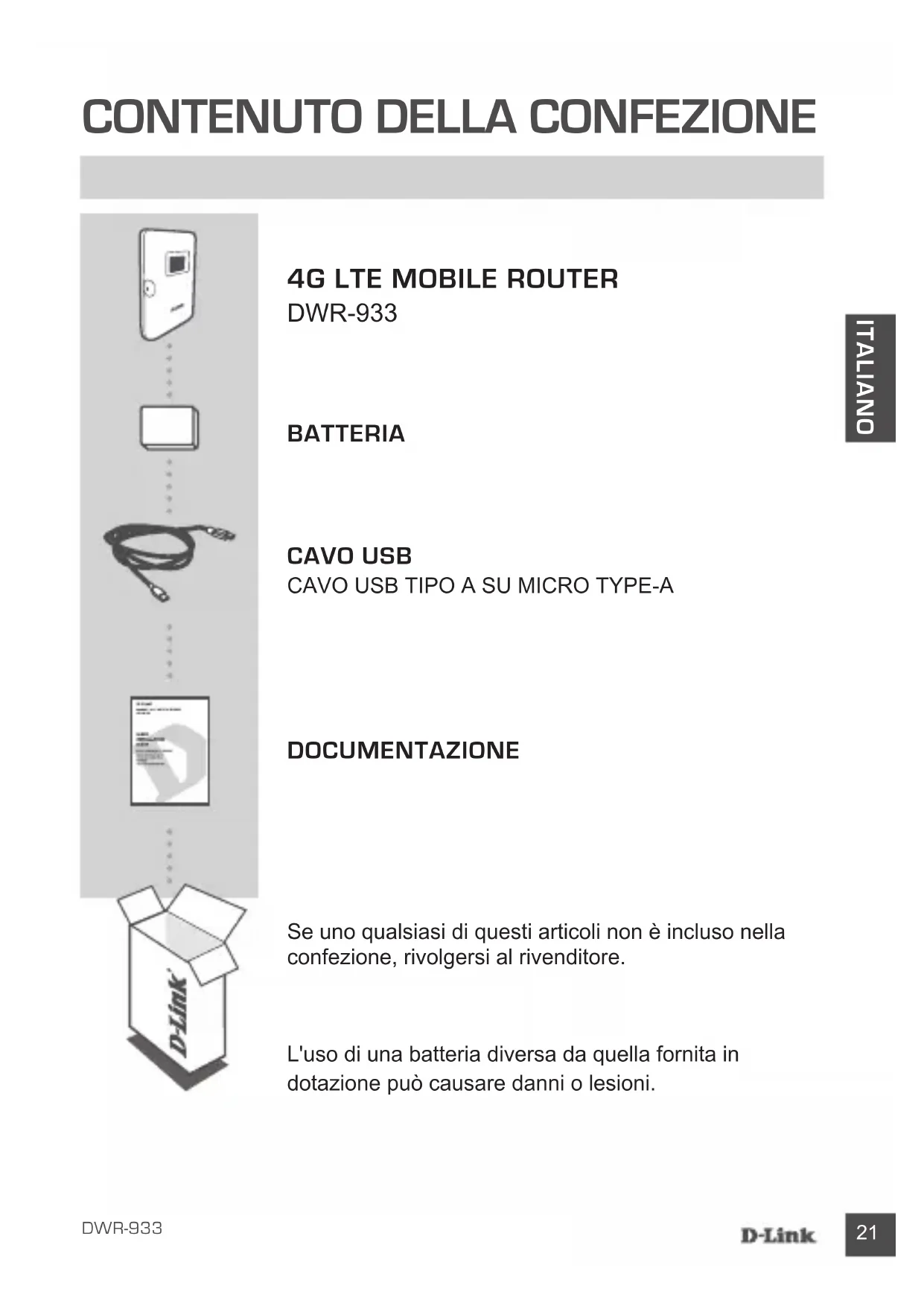 Puede pulsar el botón de alimentación para pasar por las diferentes pantallas hasta que aparezcan el nombre de la red inalámbrica (SSID) y la contraseña (Clave). Tenga en cuenta que la red inalámbrica de 2,4 GHz (2.4G) y la de 5 GHz (5G) e conguran de forma independiente. Además, puede usar WPS para conectar otros dispositivos compatibles con WPS a su red inalámbrica sin introducir la SSID o contraseña. Inicie el emparejamiento WPS en el dispositivo; después, mantenga pulsado el botón WPS del DWR-933 hasta que aparezca en pantalla el icono de WPS . A continuación se conectará automáticamente el dispositivo a la red inalámbrica. Finalmente, puede realizar un restablecimiento de fábrica insertando una herramienta na y larga, como un sujetapapeles enderezado, en el botón de reinicio situado debajo de la cubierta de la batería. Mantenga pulsado durante 10 segundos y suelte para iniciar un restablecimiento de fábrica. El SSID y la contraseña se restablecerá en los valores predeterminados de fábrica.21 DWR-933 ITALIANO CONTENuTO DELLA CONFEZIONE 4G LTE MObILE ROuTER DWR-933 bATTERIA CAVO uSb CAVO USB TIPO A SU MICRO TYPE-A Se uno qualsiasi di questi articoli non è incluso nella confezione, rivolgersi al rivenditore. L'uso di una batteria diversa da quella fornita in dotazione può causare danni o lesioni. DOCuMENTAZIONE22 DWR-933 ITALIANO CONFIGuRAZIONE DEL PRODOTTO iNSTALLAZioNE RAPiDA Fase 6: Collegare il cavo USB alla porta USB dell'alimentatore oppure a un PC per caricare la batteria. Fase 1: Sollevare il coperchio posteriore utilizzando la tacca alla base. Fase 5: Reinserire la batteria e ricollegare il rispettivo coperchio. Fase 3: Fare scorrere la scheda microSD verso sinistra no a udire lo scatto di sblocco, quindi sollevarla. Posizionare la scheda microSD sul vano con la tacca posizionata in alto a destra, quindi chiudere la staffa e farla scorrere a destra no a udire lo scatto che la blocca in posizione. Fase 2: Rimuovere la batteria utilizzando la tacca lungo il bordo superiore del vano batteria. Fase 4: Per inserire una scheda microSD, premere la rispettiva staffa verso il basso no a udire lo scatto, quindi sollevarla. Posizionare la scheda microSD nel rientro, quindi chiudere la staffa e farla scorrere verso l'alto no a udire lo scatto che la riposiziona. SIM SD23 DWR-933 ITALIANO Fase 3: Immettere 192.168.0.1 in un browser Web per accedere all'interfaccia di congurazione. Il nome utente predenito è admin, mentre il campo della password deve essere lasciato vuoto. Fase 2: Collegare il PC a una delle reti wireless DWR-933. Le impostazioni predenite sono: SSID 2.4 GHz: dlink_DWR-933-xxxx SSID 5 GHz: dlink_DWR-933-5G-xxxx Password: xxxxxxxxxx (xxxx è un codice univoco di 4 caratteri su DWR-933) Fase 1: Attivare DWR-933 tenendo premuto il pulsante di alimentazione no a quando, sul display, appare il messaggio "Benvenuto". CONFIGuRAZIONE CoLLEGARE iL DiSPoSiTiVo - TRAMiTE WiRELESS Fase 4: Utilizzare i menu della schermata per congurare il dispositivo.24 DWR-933 ITALIANO CoLLEGARE iL DiSPoSiTiVo - TRAMiTE CAVo uSb Fase 2: Collegare DWR-933 al PC utilizzando il cavo USB. I sistemi operativi più recenti consentono di installare il dispositivo automaticamente. Fase 3: Immettere 192.168.0.1 in un browser Web per accedere all'interfaccia di congurazione. Il nome utente predenito è admin, mentre il campo della password deve essere lasciato vuoto. Fase 1: Attivare DWR-933 tenendo premuto il pulsante di alimentazione no a quando, sul display, appare il messaggio "Benvenuto". Fase 4: Utilizzare i menu della schermata per congurare il dispositivo.25 DWR-933 ITALIANO ASSiSTENZA TECNiCA eu.dlink.com/support RISOLuZIONE DEI PRObLEMI PRobLEMi Di iMPoSTAZioNE E CoNFiGuRAZioNE